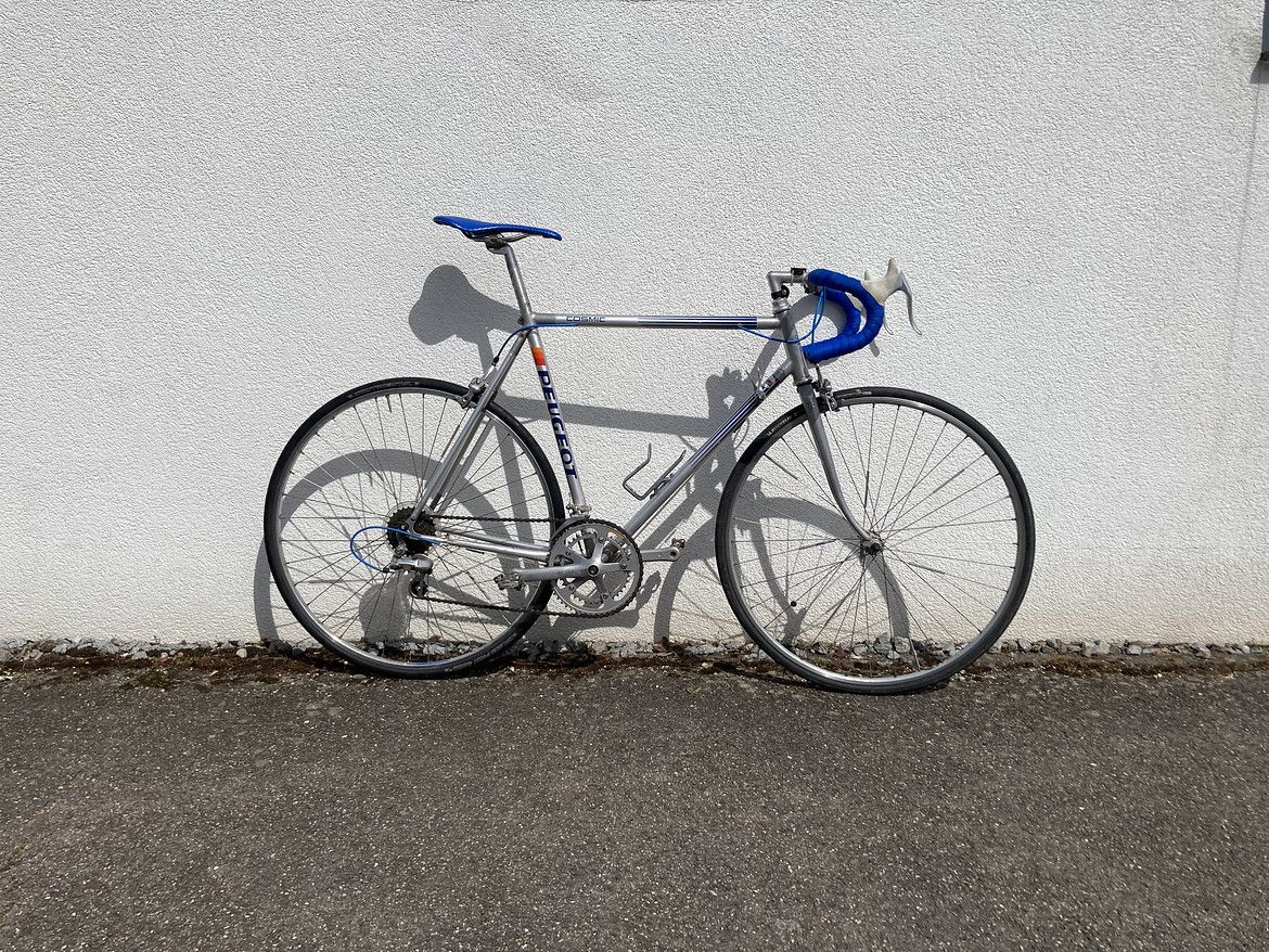 Es wurde ein neues Selle Italia Smooth Lenkerband gewickelt, neue, blaue Züge von Shimano und eine Shimano RX-100 Gruppe montiert.
