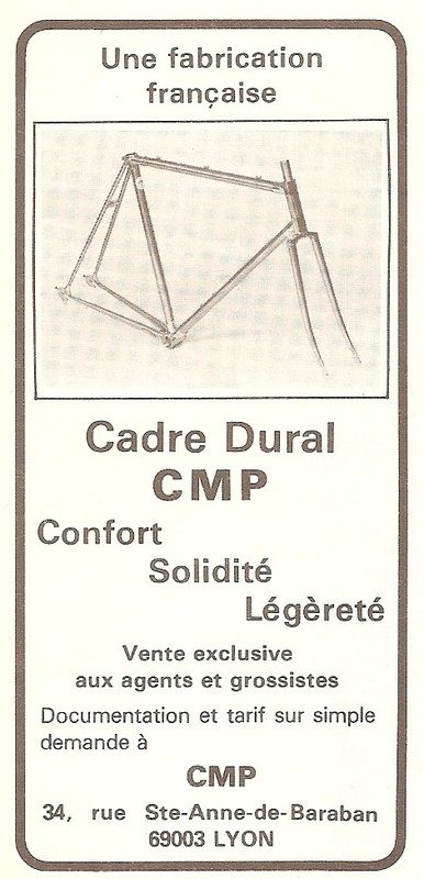 CMP. war damals ein sehr kleiner und exklusiver Rahmenhersteller der bereits schon zu Beginn der 70er Jahre begonnen hat mit geklebten Aluminiumrohren aus der Aluminiumfabrik in Pechiney in gegossenen Aluminiummuffen zu experimentieren. An die Öffentlichkeit ging man mit seinem Rahmenset übrigens im gleichen Jahr wie der Italienische Hersteller ALAN aus Veggiano