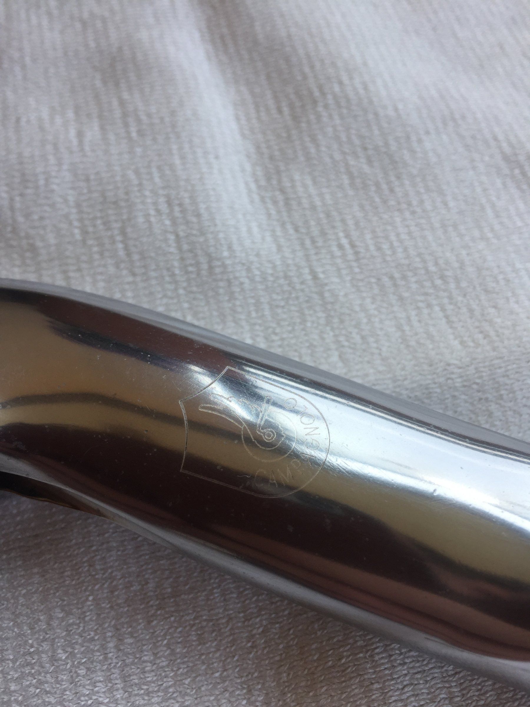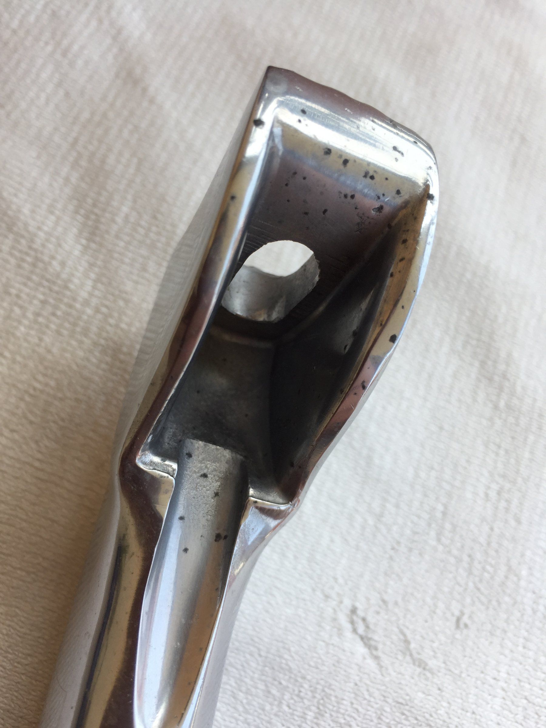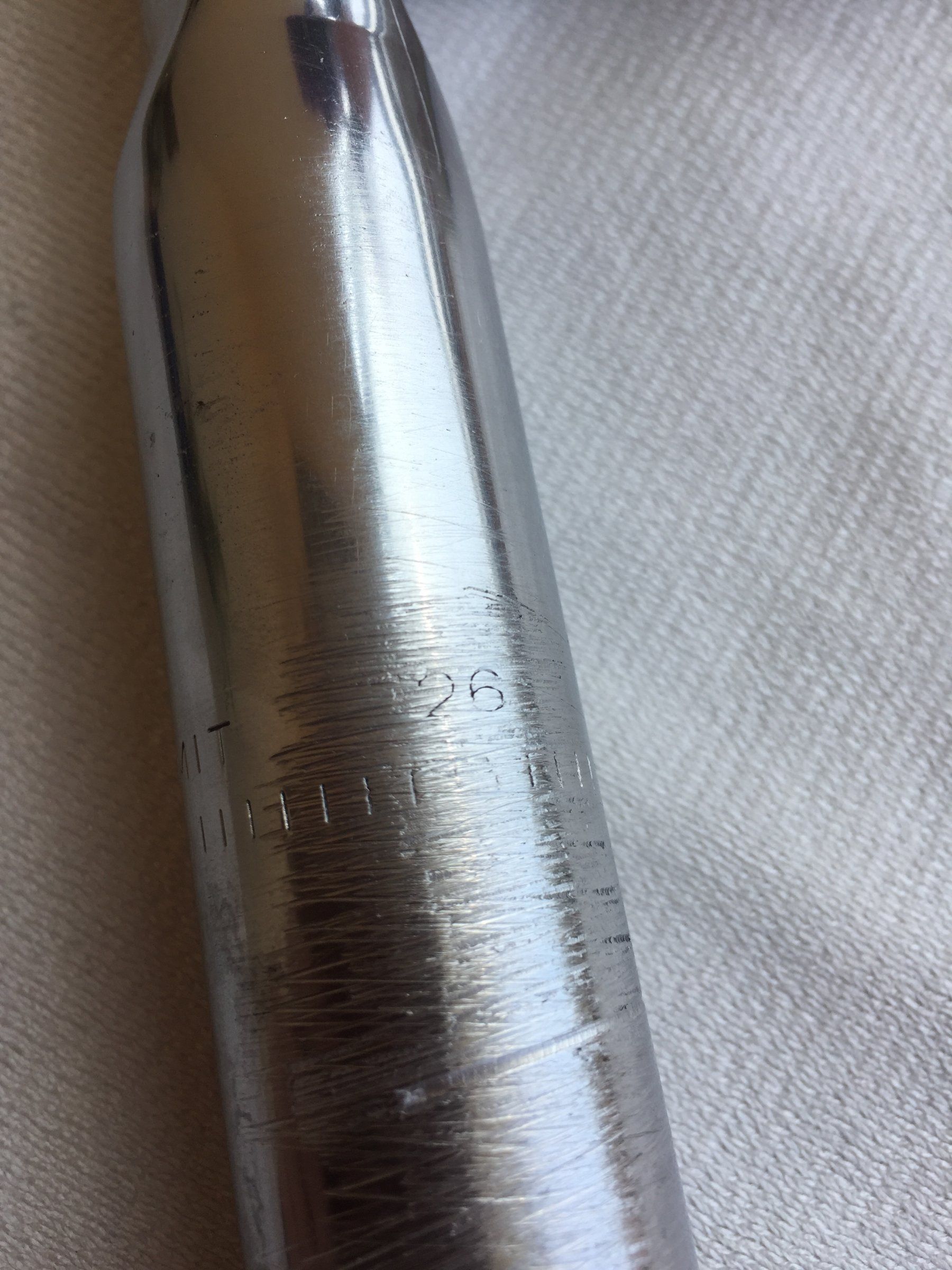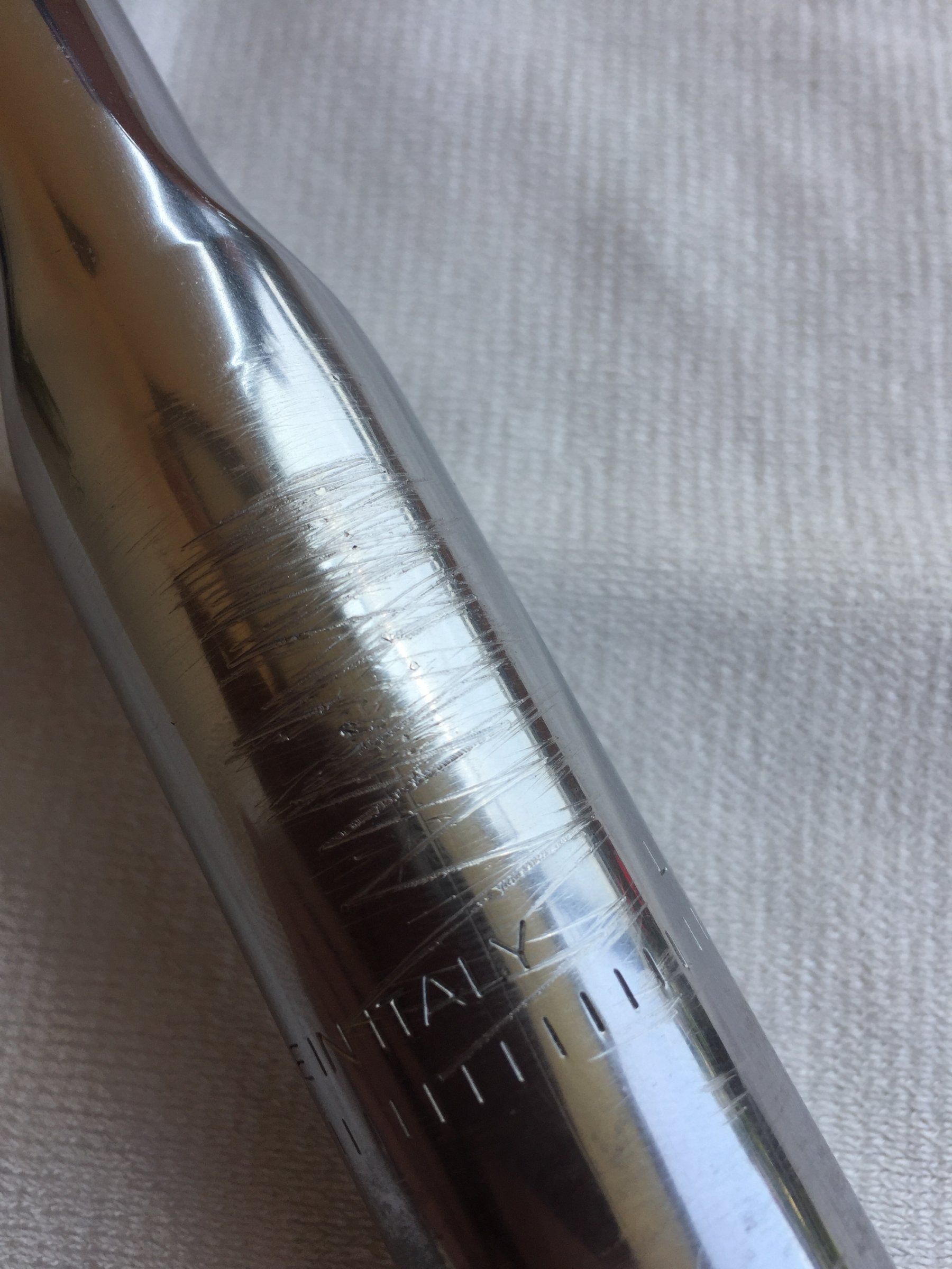 Um es wieder zu mattieren habe ich die Sattelstütze abschließend mit 1500er Mirlon bearbeitet. Zuerst hatte ich es mit kreisenden Bewegungen versucht. Weil es dann zu matt war, bin ich wieder mit NevrDull rübergegangen. Trotz mehrfachen Ausprobierens und Wiederholens dieser zwei Vorgänge entsprach das Finish nicht meinen Vorstellungen. Dann kam ich auf die Idee, mit dem Mirlon nicht in kreisenden Bewegungen rüberzuwischen, sondern immer die gleiche Richtung beizubehalten. Nun ist's so, wie ich es haben wollte und entspricht im Finish dem des verbauten NOSigen 600ax-Vorbaus: