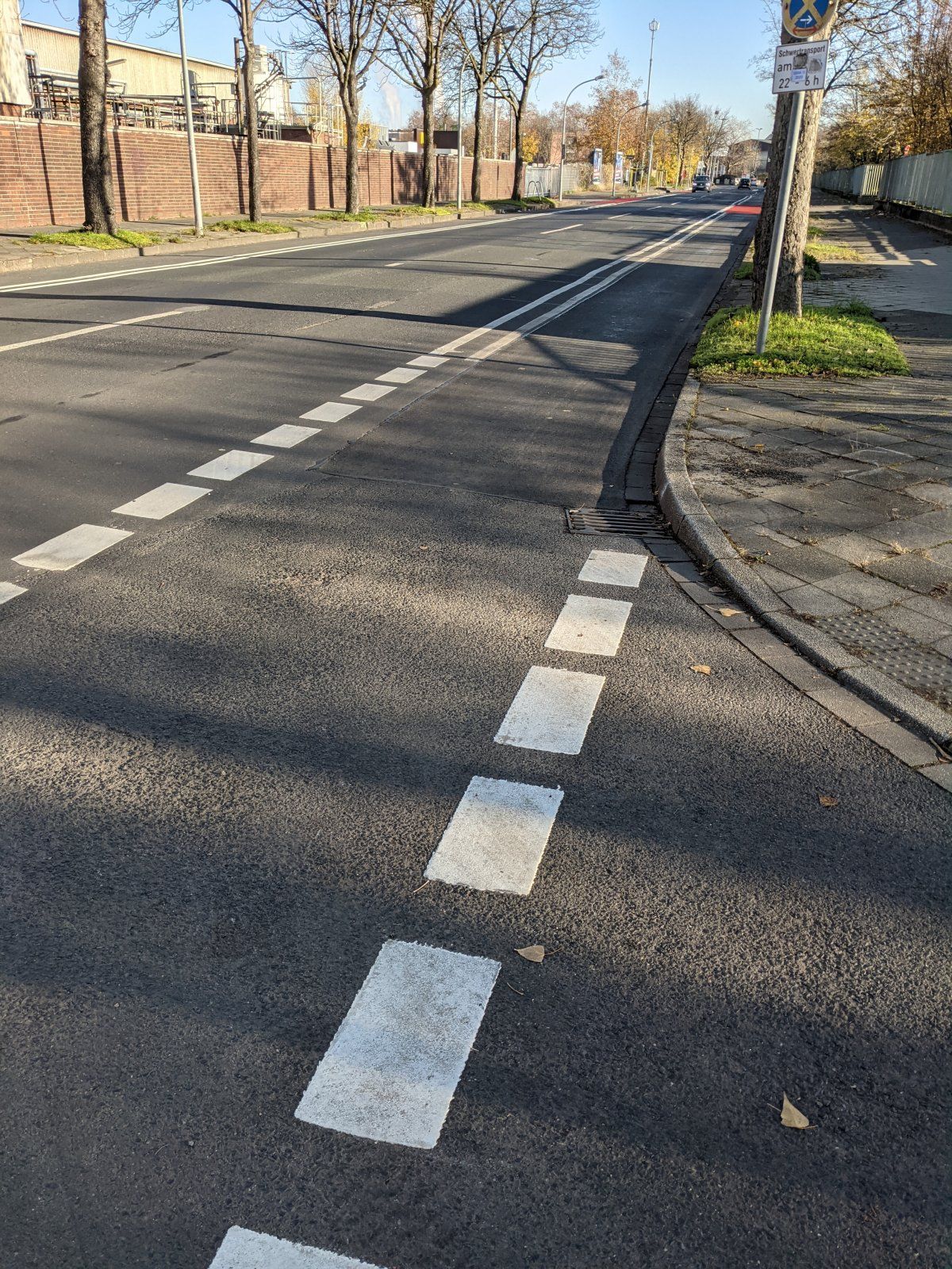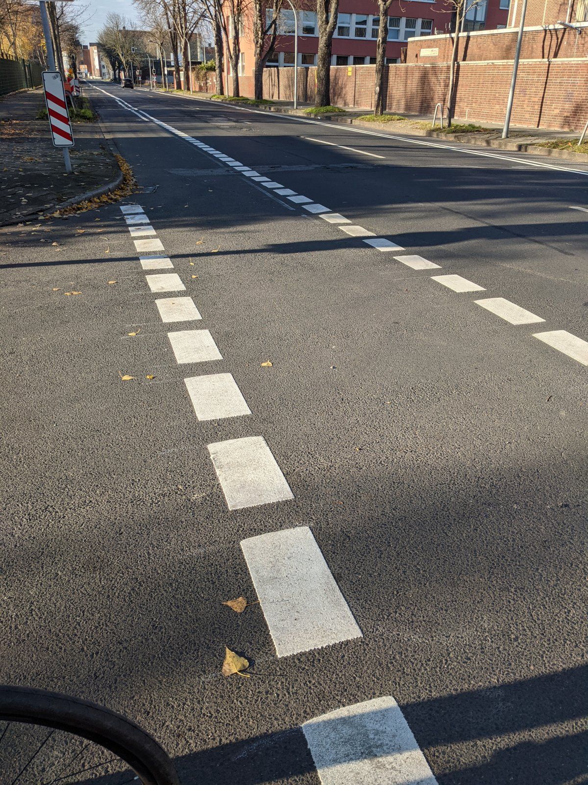Hübsch! Keine Doorzone rechts, links keine KFZ-Spur die so breit ist dass die Autos grundsätzlich illegal Zweierreihe fahren obwohl eigentlich nicht genug Platz ist (inklusive solcher mit uniformiertem Lenker, zum kotzen kotzen kotzen sind solche Zustände!), einigermaßen breit und auch keine komischen Poller oder so die einen zu absurd gefährlichen Aufmerksamkeitsjonglagen zwingen wenn man mal einen Kinderanhänger überholen möchte oder gar links abbiegen muss.