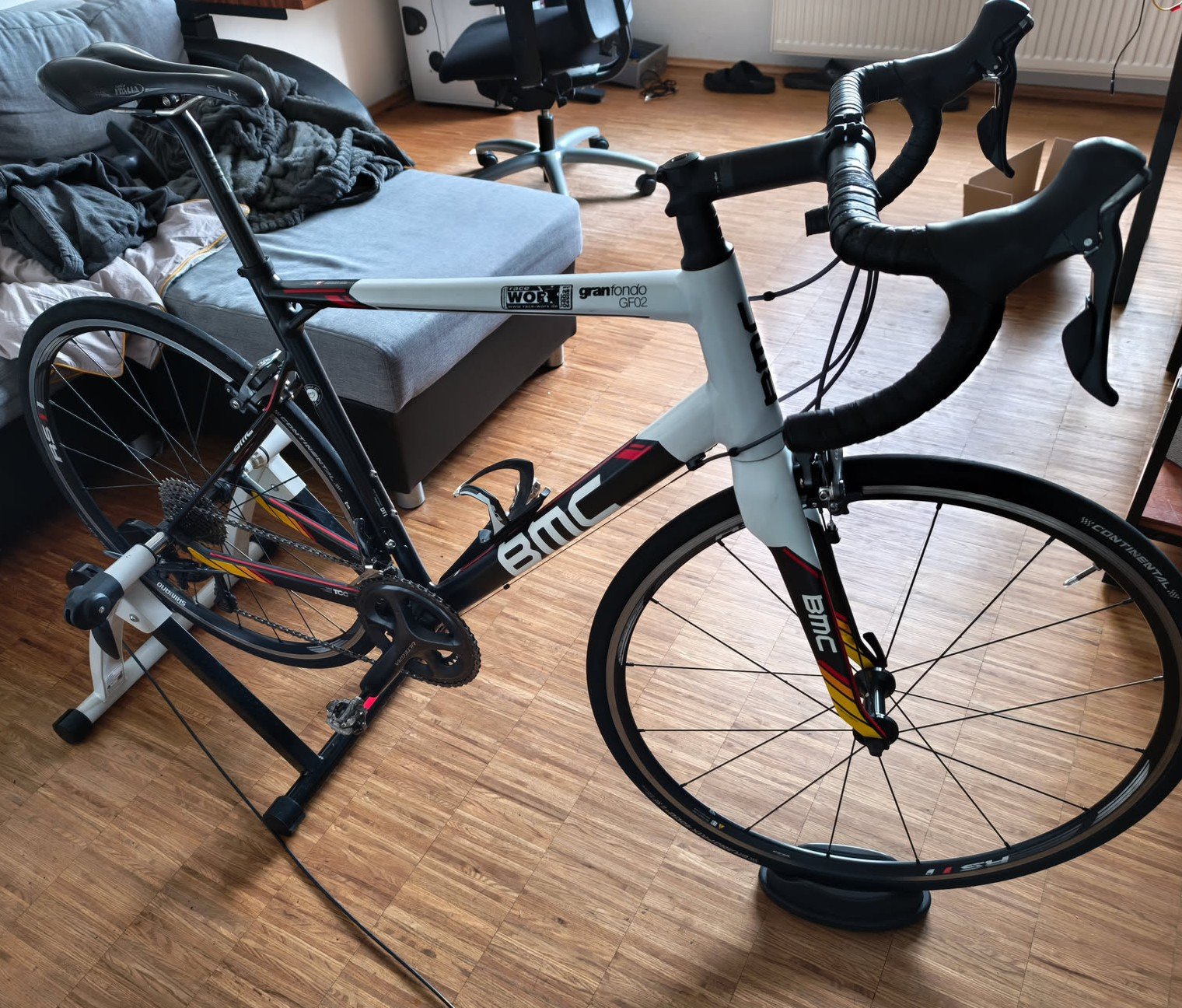 Ich habe mir für den Winter auf der ein BMC GranFondo GF02 in Größe 58 zum fahren auf der Rolle gekauft. Eigentlich eine Nummer oder sogar zwei zu groß aber war das günsigste Rad hier vor Ort und auf der Rolle reicht mir ja der Oberlenker.
