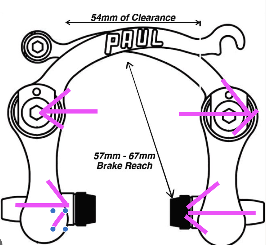 Dabei geht es natürlich nicht um zwei oder drei Millimeter, aber wenn man einen Zentimeter oder mehr rausholen will, sind klassische Bremsschuhe mit Stift (wie bei Mafac und vielen alten Cantis) im Vorteil. Die haben sehr viel mehr Spielraum beim Einstellen des Abstands zur Felge und des Winkels zum Bremsarm.