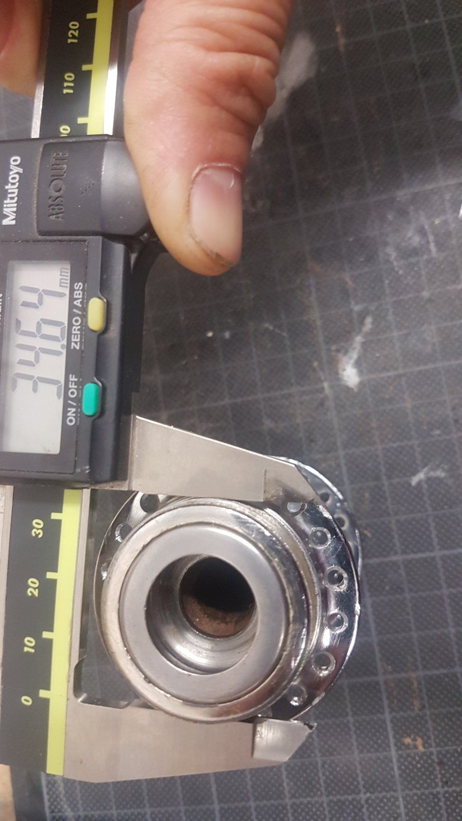 Im Durchmesser 34,64mm die Steigung sollte 1mm sein. ( Ich habe keine Gewindelehre zuhause, wede das aber morgen auf der Arbeit prüfen.)