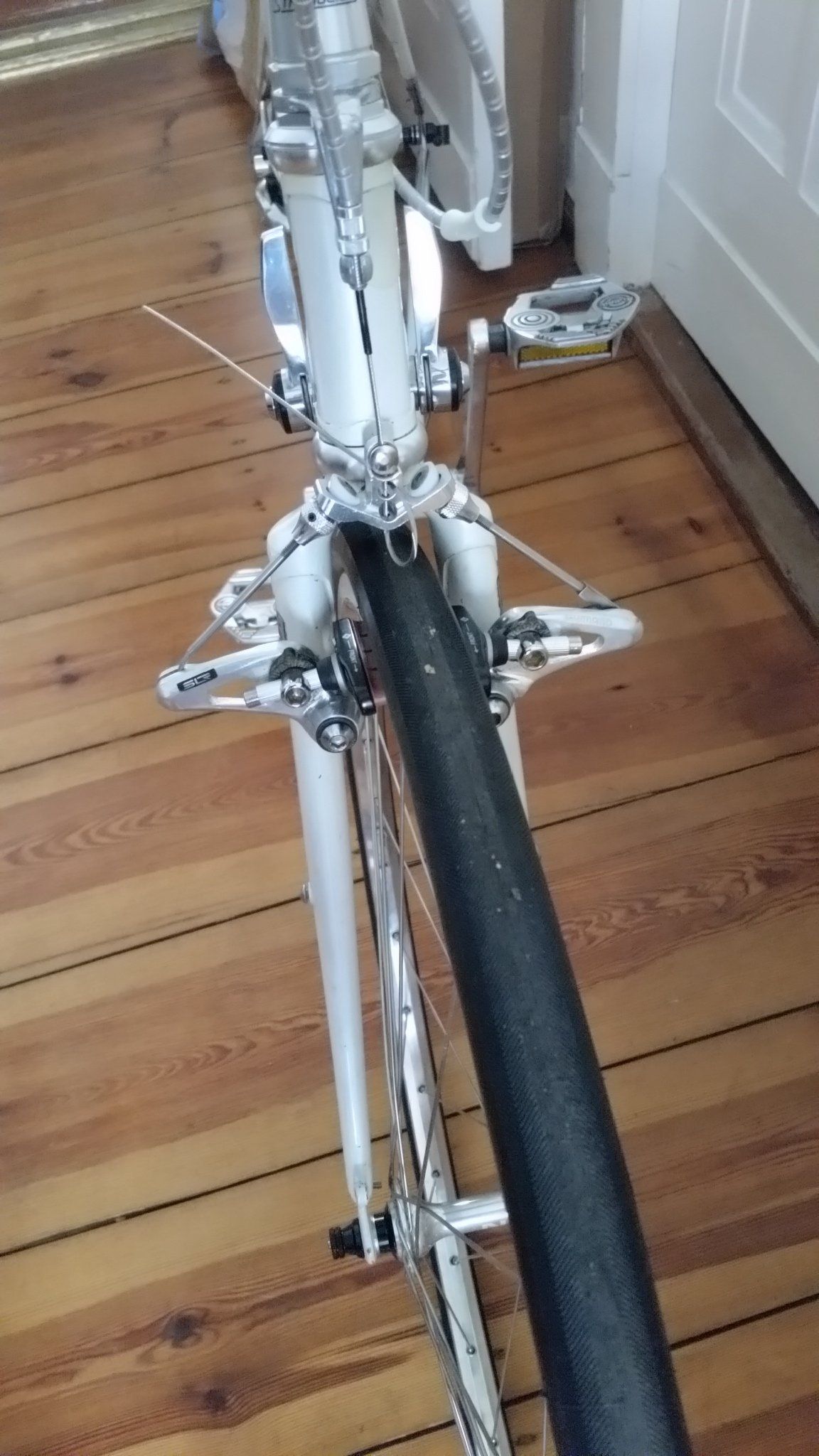 Insbesondere die Bremsen waren eine unendliche Geschichte. Extrem enge Cantisockel - 57/52mm - sagten: Shimano 600. Aber die waren vorne zu nah an den Gabelscheiden, so dass die langen Koolstop Thinlines nicht paßten, normal hoch bauende Bremsklötze aber mit der Befestigung an der Bremse selbst nicht mitspielten.. AAaargh.. Seltsamerweise passen die BR-MT62, der Grund hier: sie stehen auf den Sockeln etwas weiter ab von den Gabelscheiden und Streben hinten. Ob ich die Odyssey Straddle Rods behalte, muß ich noch entscheiden, sind doch zu fummellig..