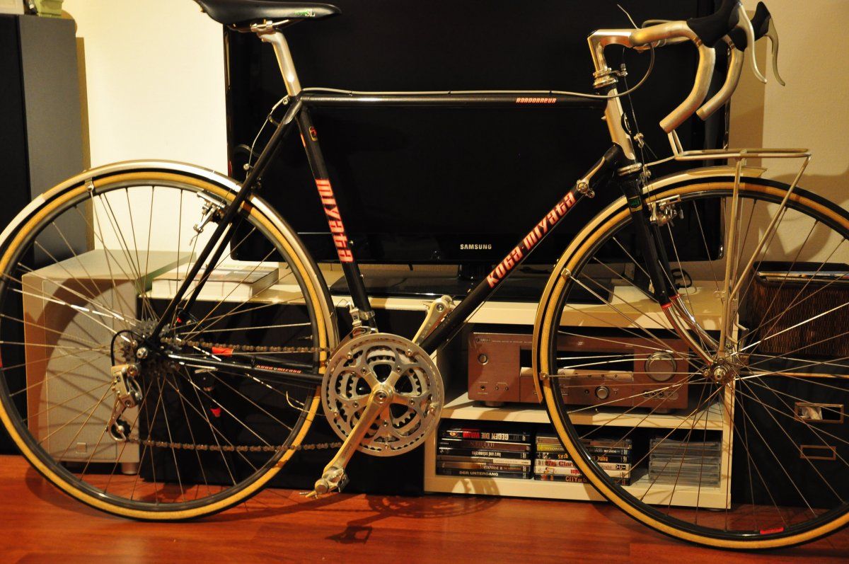 Ich habe vor, das Rad wieder mit einem Gepäckträger auszurüsten und im Laufe des Jahres ein paar Touren zu unternehmen. Das Rad ist, soweit ich weiss, ein 1986er Randonneur. Original sind, sofern ich das aus alten Koga Broschüren sehen konnte, Felgen (kaum angebremst), Reifen, Naben, 2x Umwerfer, Kurbel, Bremsen, Steuersatz, Lenker, Stütze (auf dem Foto noch nicht verbaut), Walzendynamo, Front-GT, Bremshebel sind 105er, Rahmenschalthebel sind 600er, nicht indexiert.