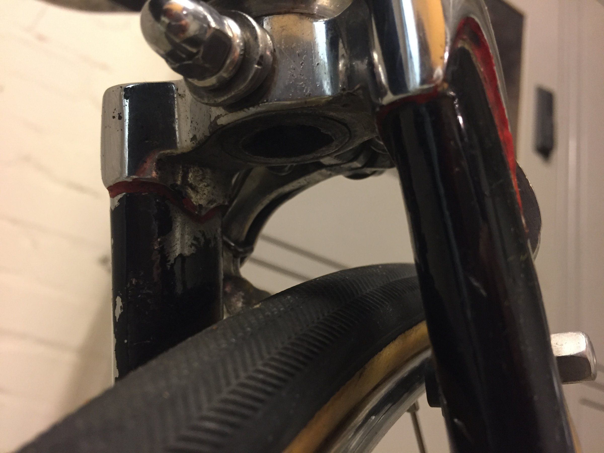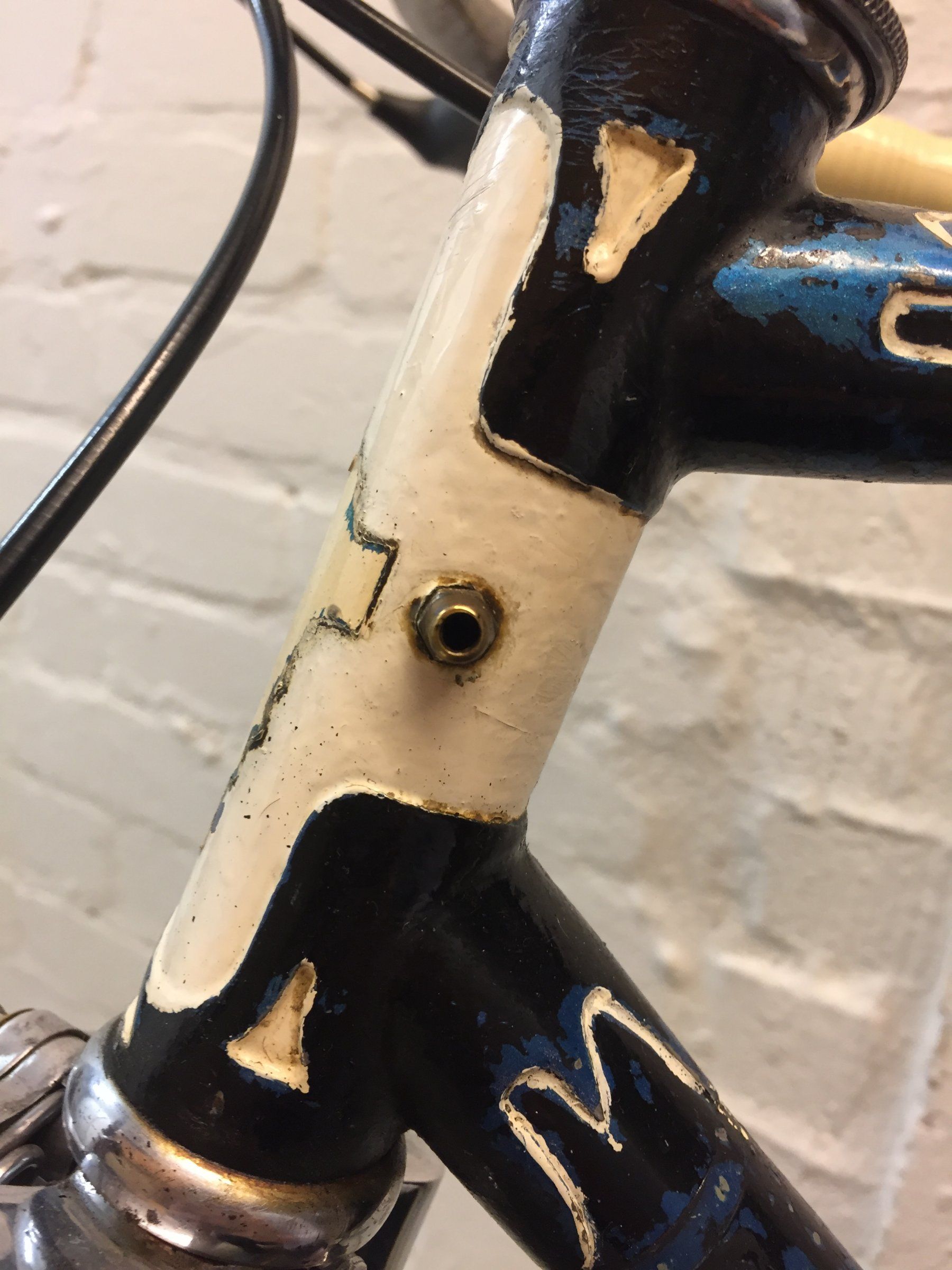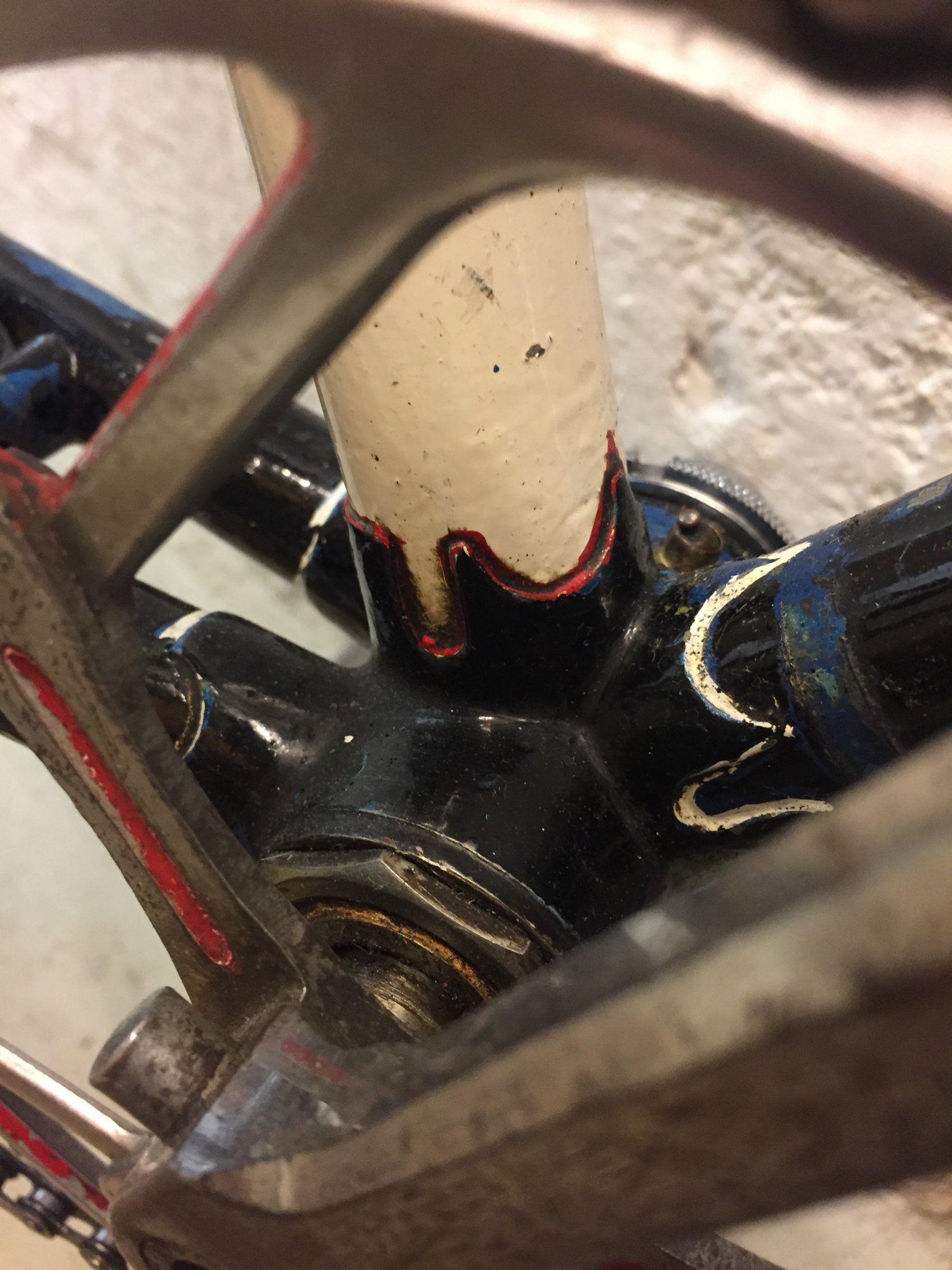 Ein Bandfeststeller war es nicht, weil sich das räumlich nicht ausgeht. Meint, daß die Bohrung und ggf- eine kleine Führung da eher im Übergang der Muffe zum Ober- oder Unterrohr hätte sein müssen.