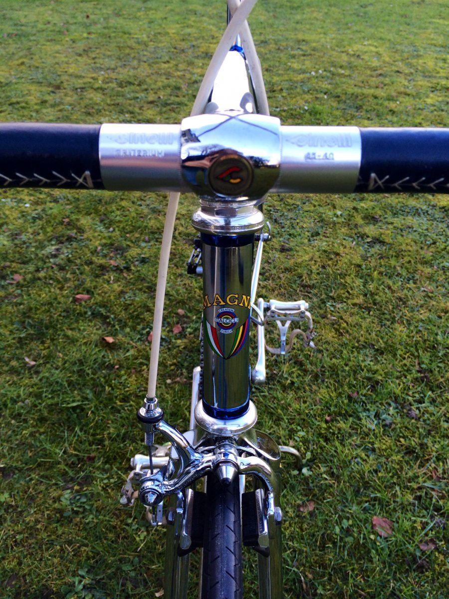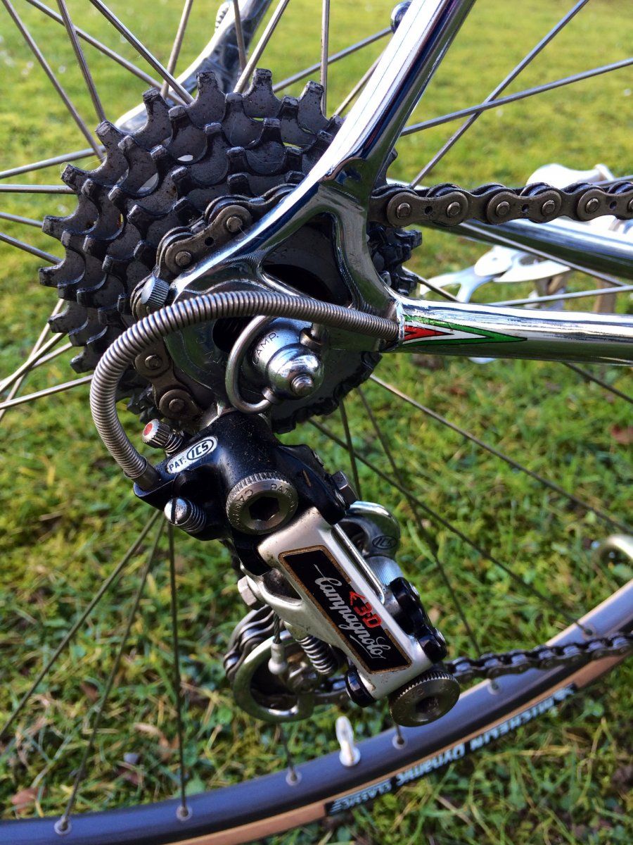 Der Rahmen wurde vom eidgenössischen Hoflieferanten Givanni "La Dolce Vita" Losa gebaut. Das Feinste sollte auch nur vom Besten angelangt werden. Columbus SL, Sattelrohr mit Sicke für den verkürzten Radstand, zum Belieben des Criterium-Connaisseurs. Diskretion ist eine schweizer Tugend und daher verschwinden alle Züge unauffällig und elegant direkt im Rahmen und treten erst dort wieder hervor, wo sie wirklich benötigt werden. Der Lack ist nach einer Vollchromkur anschließend in Zürich in Fast-Stadtfarben von Appenzeller Edeldamen aufgehaucht worden. Cromovelato in Perfektion.