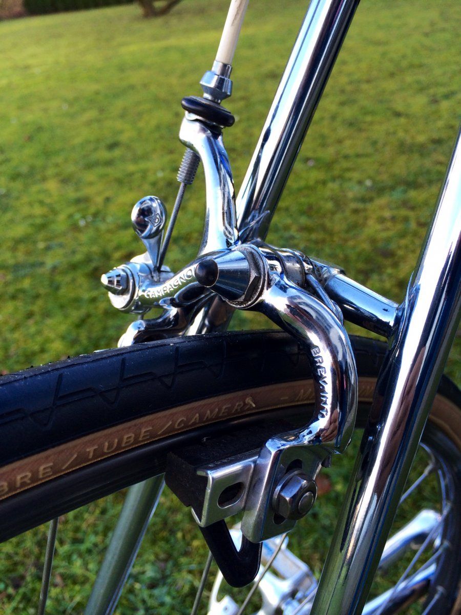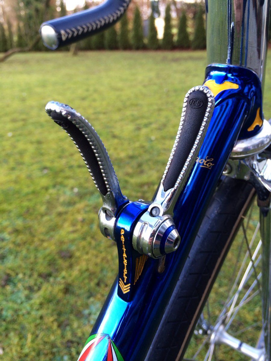 Der Cinelli-Vorbau kann dank polierter Chromoberfläche endlich als Spiegel verwendet werden, um während der langsamen Fahrt bei gutem Wetter den Teint zu überprüfen. Leider hat ICS bis zur C-Record-Serie keine Pedale getunt. Daher müssen zur Zeit diese eher unpassenden Exemplare als Ersatz dienen.
