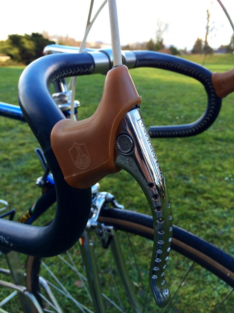Der Bremshebel punktet mit seiner perfekten Oberflächenverarbeitung und dient dank seiner grellen Glanzfunktion als stromloses Doppel-Frontlicht. Der Lenker schmeichelt in feinstem Känguru-Leder den Händen des sportlich ambitionierten Bankier-Erbens. (Die Schramme am rechten Bügel stammt von einer unsachgemäßen Benutzung durch einen bürgerlichen Rennrad-Proleten, der meinte, damit tatsächlich Radfahren zu müssen...)