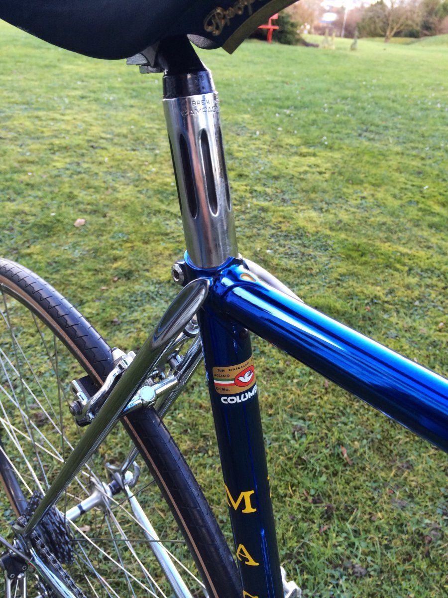 Die Sattelstütze ist natürlich ebenfalls verchromt. Zu meiner Enttäuschung ist sie nicht in passendem Dunkelblau eingelassen, sondern in primitivem Schwarz. Die Funktion bleibt trotz dieses Fauxpas unbeeinträchtigt.