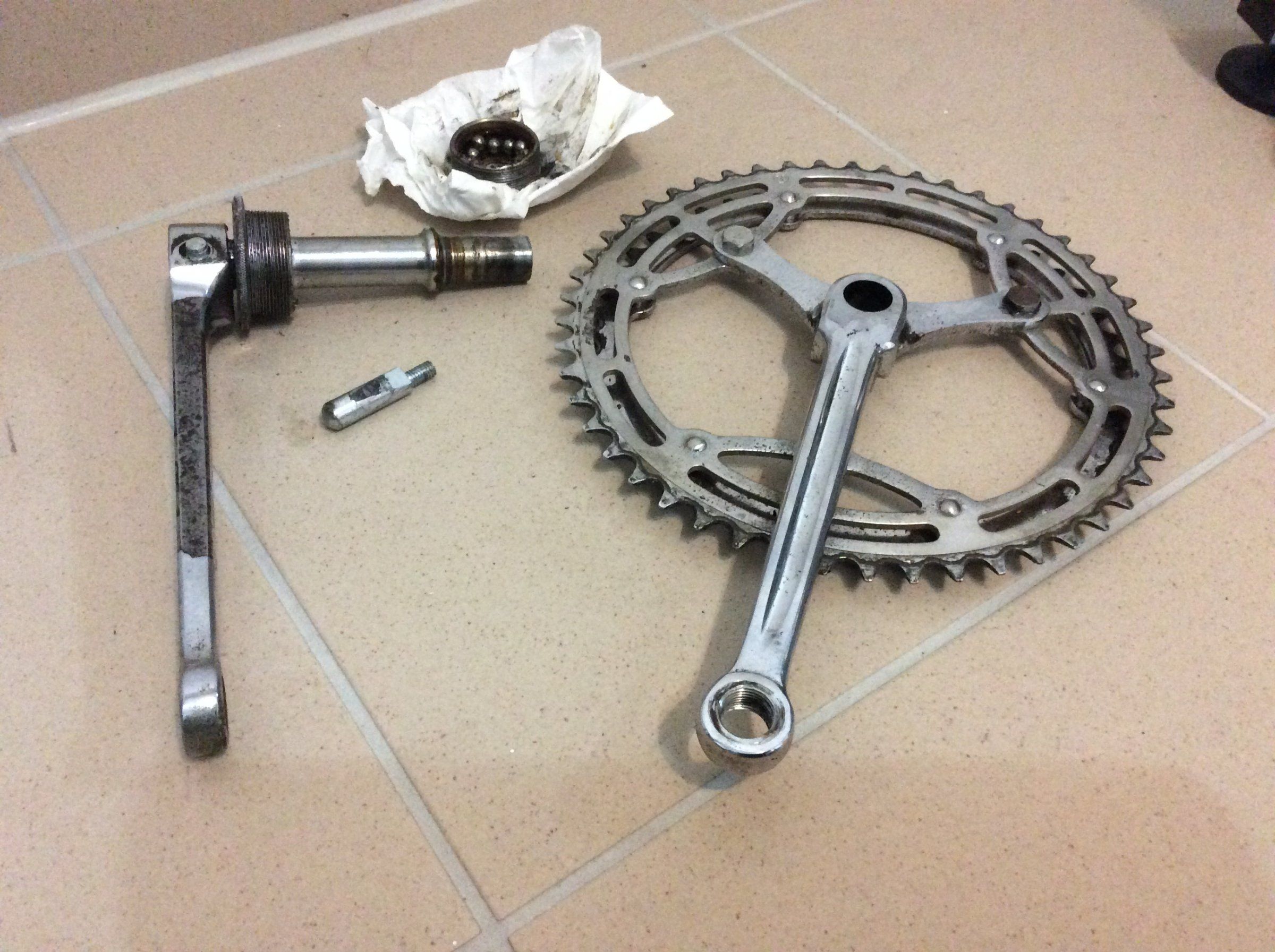 Der linke Klemmkeil wollte ums Verrecken nicht raus (jetzt weiß ich auch, warum links der Chrom runter ist). Also rechts probiert und da ging es super. Zum Glück waren die Lagerschalen nicht festgegammelt, sonst hätte ich die linke mit dranhängender Kurbel nicht raus bekommen.