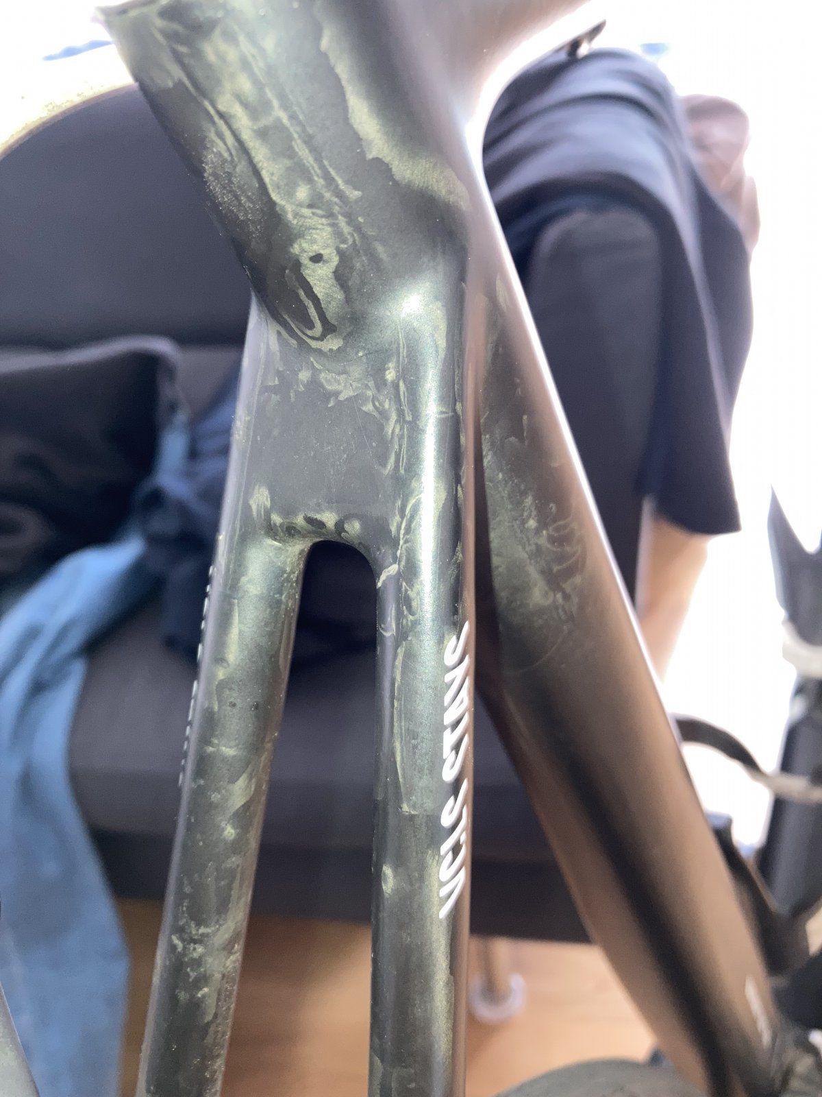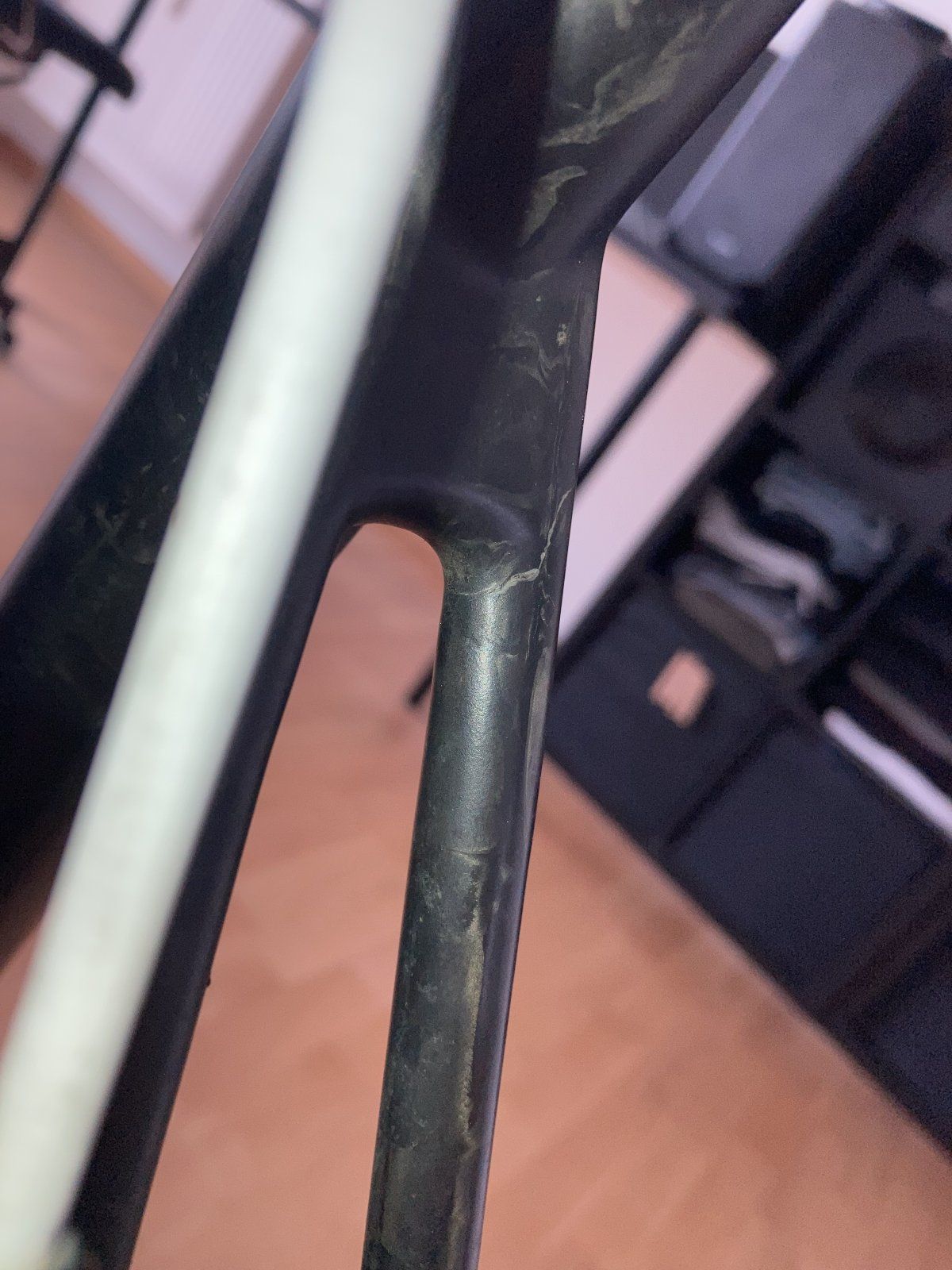 Dieser Riss ist mir bei meinem Rennrad heute aufgefallen. Mir ist zwar bewusst, das eine eindeutige Analyse über Fotos schwierig ist, wollte aber trotzdem mal fragen, wie das einzustufen ist. Für mich ist es nicht erkennbar, ob es nur der Lack ist oder auch das Material darunter.