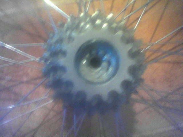 was ich dann auch einfach abziehen konnte, war das ritzeelpaket und ich denke der freilauf steckt da noch drin. auf der nabe sitzt jetzt noch das runde gegenstück, auf das der freilauf (mit ritzeln) gesteckt wird.
