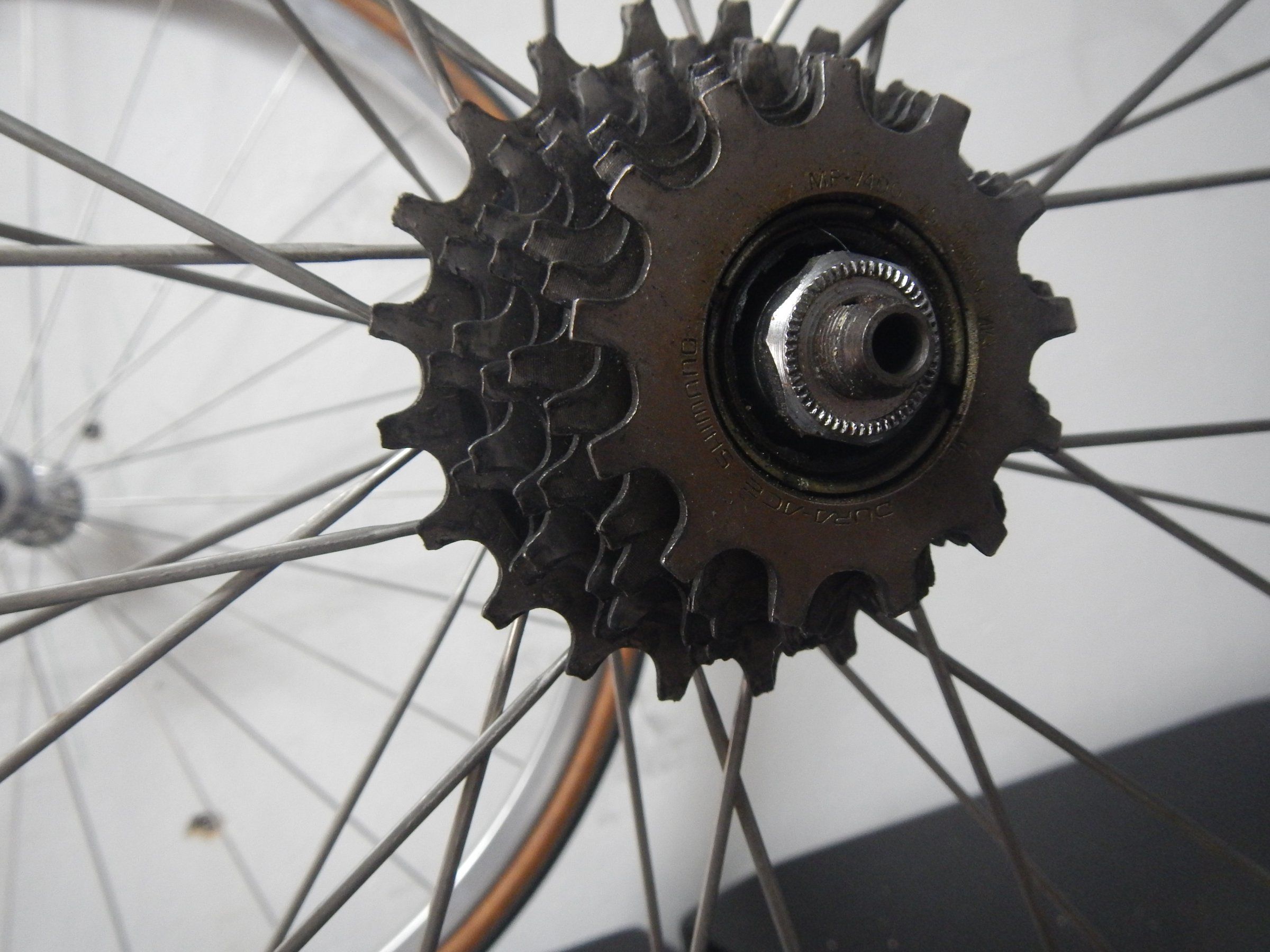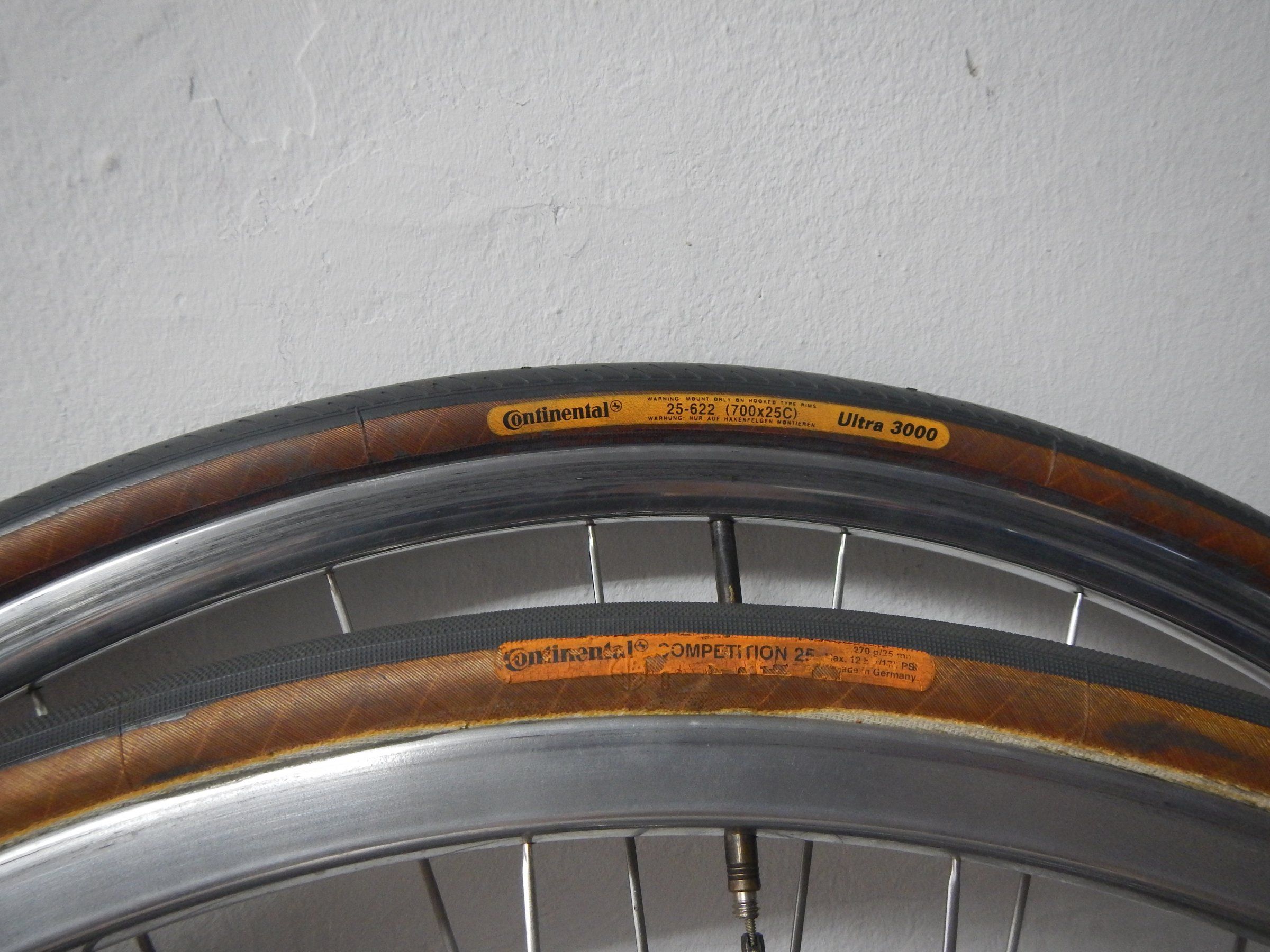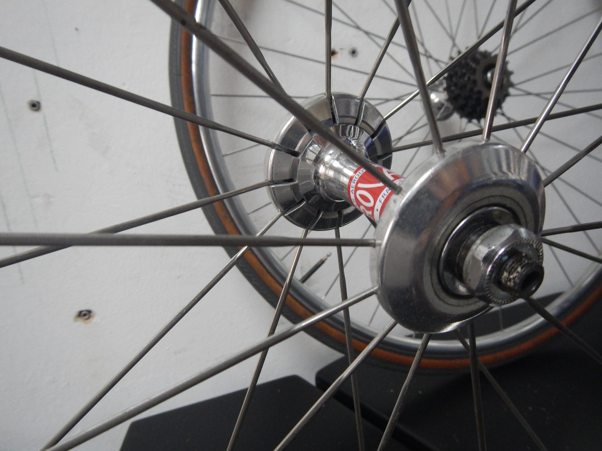 Gestern habe ich für ganz kleines Geld ein recht unspektakuläres, aber exakt passendes CIlo-Rahmenset aus Columbus Gara ergattert. Der Verkäufer schenkte mir dazu noch ein paar Anbauteile und eben diesen Roval-Laufradsatz, der auf den Fotos zu sehen ist. Die Speichen (wohl 30/36) machen allesamt einen festen und stabilen Eindruck. Die Kassette ist eine 7-fache Sachs LY 94, und die Felgen sehen noch ziemlich gut aus. Auf der Hinterradnabe fehlt leider der schöne Aufkleber.