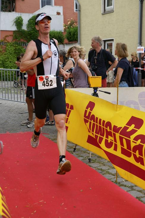 An der Wende konnte ich kurz auf meine Uhr sehen und hatte 7:xx drauf, am Rückweg 5:xx- dann kam für mich das blödeste vom ganzen Triathlon: ein ca. 200 Meter langes Stück durch die Gassen auf Kopfsteinpflaster barfuß in die Wechselzone (Schwimmzeit inkl. Lauf = 14:10), auf's Rad und weiter.