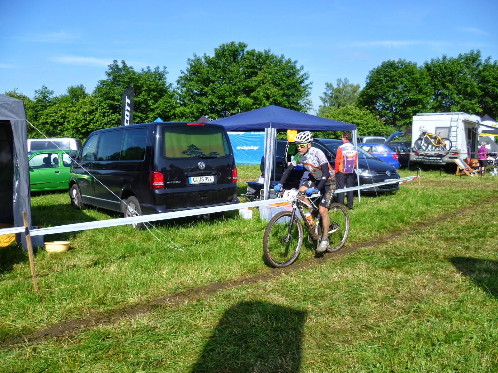 also steckte ich die Kurbel wieder notdürftig ineinander und kam irgendwie so wie mit einem Tretroller den Berg runter und sprintete gefühlt 2 Kilometer flach weiter durchs Ziel um die Runde zu werten und dann zu Tajana... dort das Rad in die Ecke geworfen und ich wollte eigentlich aufgeben, aber Tajana motivierte mich mit unflätigen Worten, dass jetzt nicht aufgegeben wird...also versuchte ich das Bike wieder zu richten , aber die Clavicula war nicht mehr zu reparieren, weil die Klemmschraube verloren gegangen war...also das Ersatzrad flott gemacht und weiter ging es mit Klingel am Lenker ...