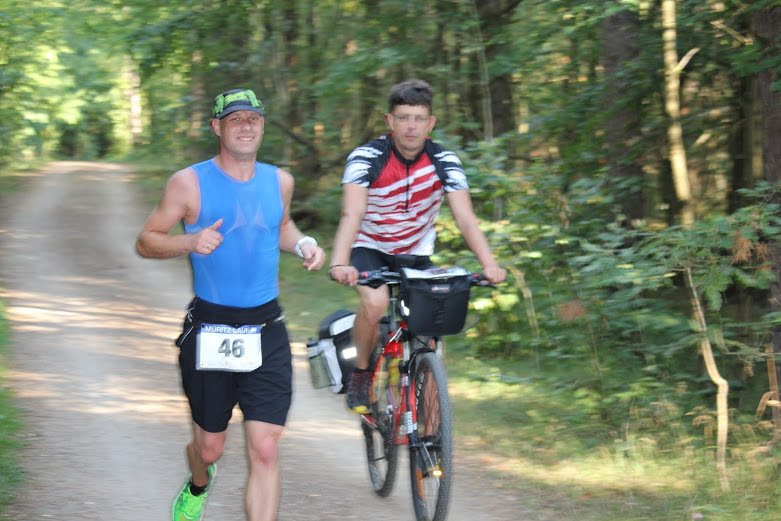 Samstag früh ordentlich gefrühstückt und ab gings zum Start. Punkt 8 Uhr Startschuss und es ging los. Die ersten 30 km war es noch schön "kühl" max. 19°C so konnte ich meinen geplanten schnitt von 4:45 min/km sehr gut Laufen und lag auf einem guten 2. Platz. Verpflegung klappte auch anstandslos alle 2,5 km Trinken alle 5 km Essen. Meine Radbegleitung Thomas überwachte dies gnadenlos. Ab Rechlin km 33 verläuft die Strecke nur noch über Freiflächen, kein Schatten, kein Lüftchen und das bei 27/28°C. Thomas hatte ab da keinen so leichten Job mehr. Ich bekam (aufgrund der Sonne??) Kopfschmerzen. Lief aber erstmal weiter. Immer drauf achtend den Schnitt nicht zusehr fallen zu lassen. Das klappte bis nach Röbel (km 50) noch ziemlich gut, auch wenn mir da schon ab und an schwindlig wurde. Egal es ist ein WK und da wird gebissen. In Zierzow dann der völlige Blackout, da läufst du parallel zur Bundesstr. bergan und am Gipfel biegt man 90° rechts ab und nach 400 m kommt die Verpflegung, lt. Thomas habe ich da bereits die komplette Radwegbreite gebraucht, ich konnte weder Leute erkennen noch kommunizieren, Kopfschmerzen Schwindlig schwarz vor Augen. Verpflegung gegriffen und fast zu Boden gegangen. Ok, Kreislauf also völlig hinüber aber 18 km vor dem Ziel Aufgeben? Niemals!! Traubenzucker rein, Cola drauf, Wasser über den Kopf und weiterlaufen mit kurzen Gehstücken, immer weiter!! Sicher nicht die cleverste Variante aber eine funktionierende. Thomas übeerwachte stets mein Ess und Trinkverhalten und trieb mich dazu an. Ich wurde langsam wütend auf mich und meinen nicht funktionierenden Körper. Wer kennt nicht Over the Top mit Stallone? ALso Mütze Schirm nach hinten und Brille auf. Und dann schön in die Fresse, solange der Kopf sagt Laufen geht das auch.