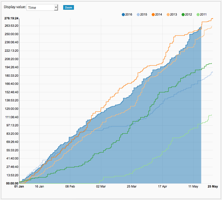 Ich mag Zahlen, und der Blick auf die Auswertungen hilft mir als Orientierung, wo ich stehe. Insgesamt lande ich bei den Trainingsumfängen bei ziemlich ähnlichen Zahlen wie 2014 (wo ich ebenfalls für Lanza trainiert hatte), was man schön an der Statistik sehen kann: