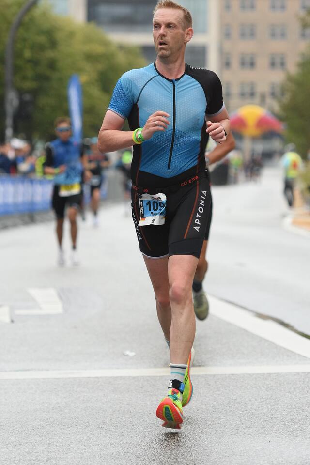 Am Ende der zweiten Runde lag eine Triathletin auf der Straße, die sich scheinbar schwer verletzt hatte. Die Ordner zeigten schon an langsamer zu fahren und sie wurde am Boden liegend erstbehandelt. Schräg an der Stelle stand ein Taxi, ich vermute dies war der Grund für den Unfall. Zu Beginn der dritten Runde bin ich erneut da vorbei gekommen, da war schon der Rettungswagen da. Ich bin weiterhin vorsichtig gefahren, da ich auf einen Ausrutscher keine Lust hatte. Soll es mehrfach gegeben haben, wobei ich niemanden gesehen habe. Nach 5:13 Stunden kam ich dann vom Rad runter, wechselte nochmal die nassen Socken, die Vaseline die ich mir für die Brustwarzen bereit gelegt hatte, verwendete ich großzügig zwischen den Zehen um bei dem Wetter keine Blasen zu bekommen und los ging es auf die Laufstrecke.
