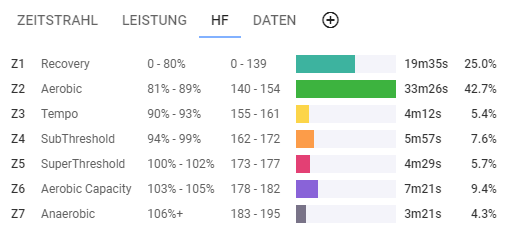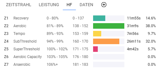 Hier bin ich dann an einem Punkt, an dem ich vermutlich Laktat messen muss bzw. auch einfach schauen muss, wie sich die HF entwickelt. Sich hier also etwas runter zu regeln, auch wenn nach Berechnung der Wert eigentlich passen sollte, ist daher vorerst das einfachste und vermutlich beste, was ich machen kann.