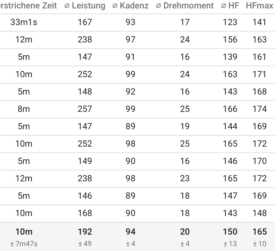 Mir scheint, als hätte ich alles richtig gemacht mit meinen minus 15 W beim zweiten pvo2max-Test :D Aber ernsthaft, ich fahre die Intervalle im zweiten Block weiterhin mit dem ersten, höheren Testergebnis, will schließlich keine Rückschritte machen.