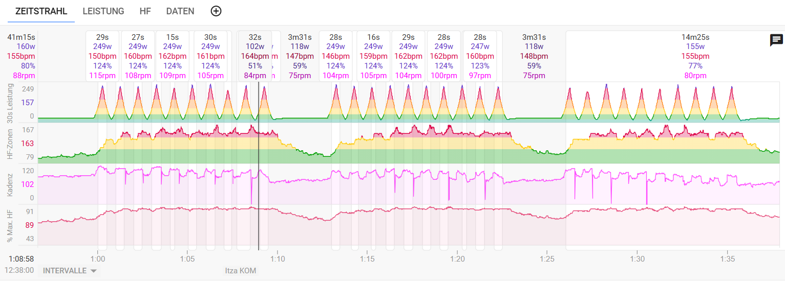 Super vorgegangen. Geradezu vorbildlich!Bin dann heute auch die 30/20 gefahren. Nach 2 Tagen HIT heute war klar, dass ich 93% nicht packen werden, da das meine Maximalleistung mit frischen Beinen darstellt. Aber probieren wollte ich es zumindest, damit ich für später bessere Richtwerte habe. Die ersten 2 Sätze gingen mit 93%, danach musste ich reduzieren. Wieder geguckt, dass die HF im HIT-Bereich bleibt und für mich beschlossen, dass das so in Ordnung geht.