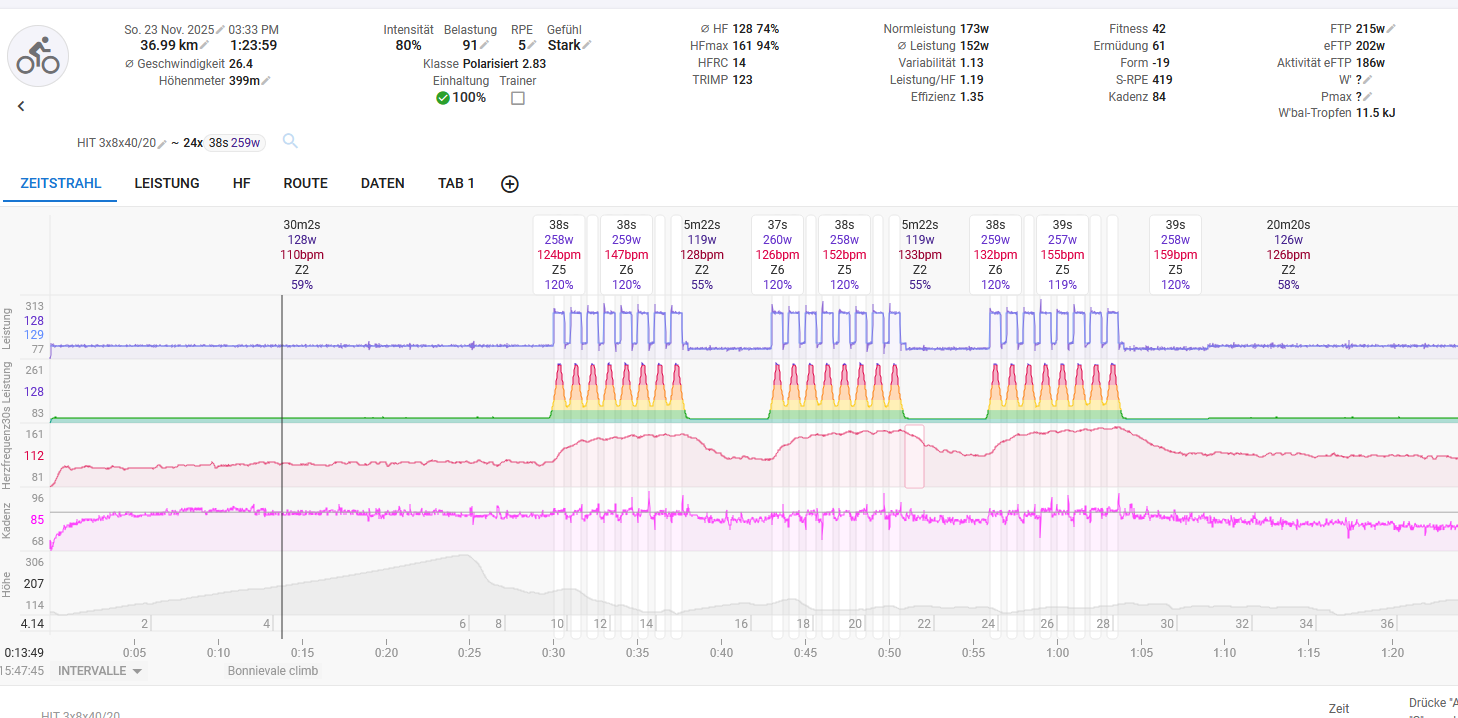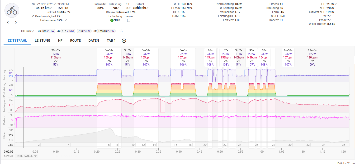 Schon im zweiten IV musste ich Tritte auslassen, im Dritten gar 2min Pause im IV machen. Dachte schon ans abbrechenm aber komischerweise ging das 4 und 5. Intervall dann wieder gut, trotz (oder wegen?) deutlich höherer HF.
