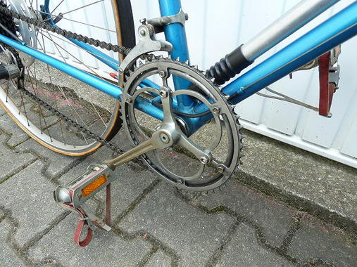 Nur erst mal so viel, der Rahmen hat eine Höhe von 52 cm, Mitte Tretlager bis Oberkante Rohr. Die Schlauchreifen haben fertig, Luft drauf, Luft runter :D,Bremsen, Schaltung, Kette, Rahmen, Lenker wie neu, Pedalarme, Sattelrohr und die Speichen haben leicht Flugrost angesetzt. Eine Tube Elsterglanz sollte das richten. Ein Bündel nagelneuer Speichen habe ich aber auch noch.