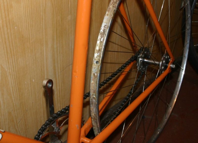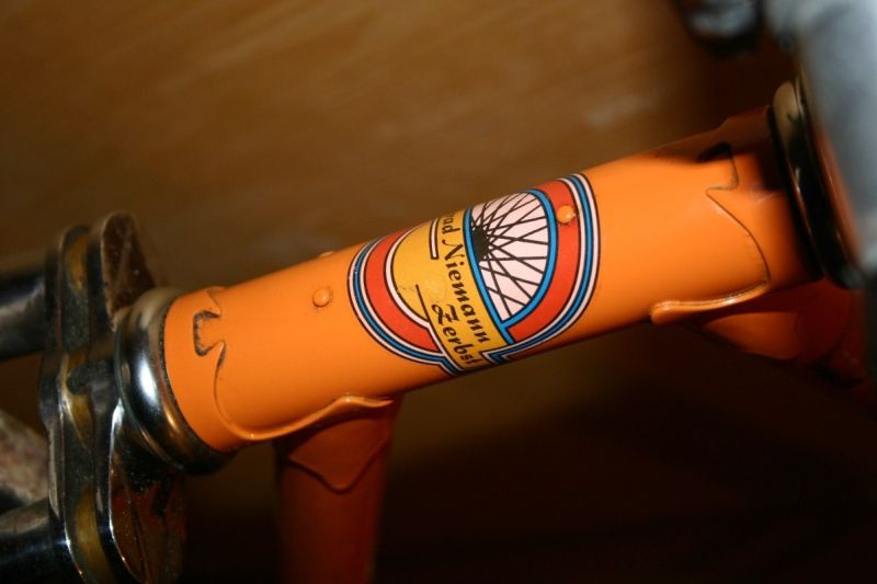 Leider hat der Rahmen 2 kleine Dellen im Sattelrohr und natürlich einige Lackmacken von seiner