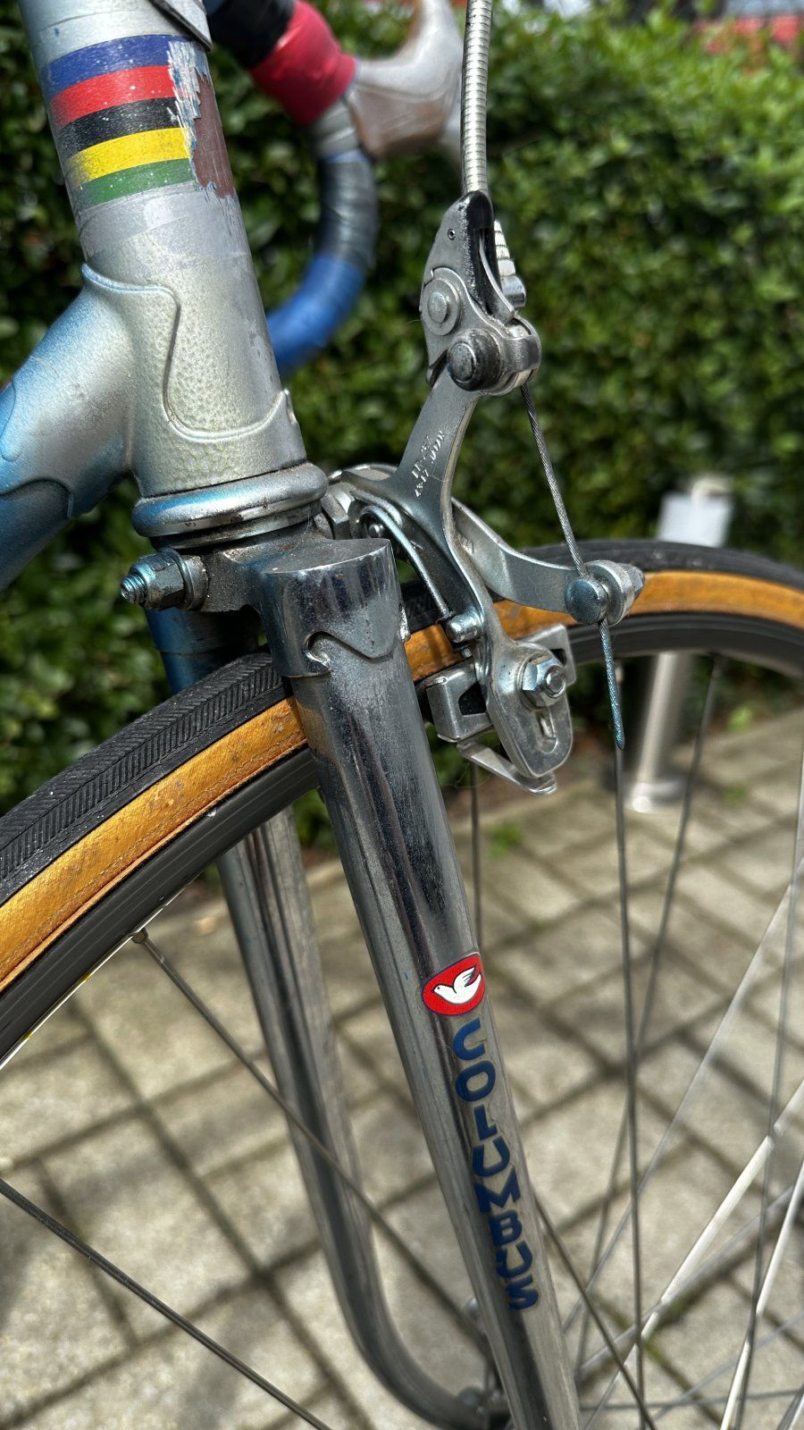 Der Zustand ist, nun ja, sagen wir mal verlebt. Der Lack ist nicht der Beste, sofern man ihn noch erahnen kann. Rad wurde wahrscheinlich mal mit ner Sprayflasche bearbeitet, Roststellen mit Aufkleber kaschiert. Die Komponenten sind wild gemixt. Shimano 105(?) Bremsen, Rasant-Umwerfer, Diamant Kettenblätter und Innenlager, Gipiemme-Naben mit Campa-Felgen. Lenker-Vorbau wieder Diamant und Grünert(?). Zustand: dreckig, verharzt aber rettbar. Nun zu den Merkmalen, die vielleicht etwas zur Herkunft aussagen könnten. Der Rahmen ist lt. Nummer von 1972 (6654x2xxx). Nun zu den Fact´s die abweichen. Im Tretlager ist ein "B" eingeschlagen. Sollte also eigentlich ein 58er ct sein, gemessen sind aber nur 56 ct. Verändert? Die Oberrohrzugführungen, die Muffen und das Schaltauge passen auch nicht zum Baujahr. Auch verändert? Sollte dies ein Elsner-Rahmen sein? Dem widerspricht der Pumpenhalter vorn und die Ausfallenden. Die Komponenten sind, Umwerfer und Kettenblatt ausgenommen, später verbaut wurden und können nicht aus 1972 sein. Die Gabel ist vollverchromt, der Columbusschriftzug ist ein Aufkleber. Die Muffen passen ebenfalls nicht zur Elsner-Theorie.