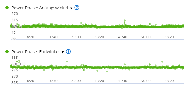 Man sieht, je weiter ich mich ins Jenseits schieße, umso weiter vor dem OT fange ich an zu schieben/ziehen (Anfangswinkel-Punkte wandern nach oben, bis 315°), und umso weiter hoch zieht man auch noch das Pedal um den UT (Endpunke wandern nach unten, Richtung 315°). Wenn ich das richtig deute, geht die Kraftphase am Ende also sogar quasi komplett rum, also wohl der sagenumwobene "runde Tritt". Wenn es denn darum geht, um die gesamte Kurbelumdrehung Kraft einzuleiten. Das Ganze passierte aber