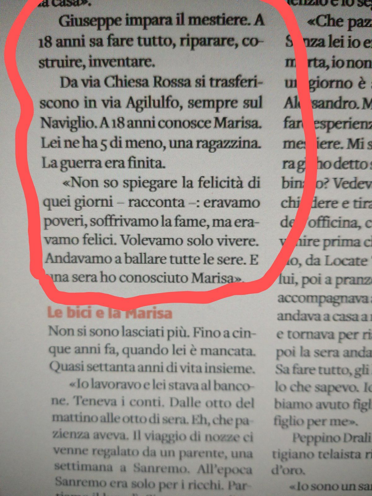 "Ich kann mir die Freude der Tage nicht erklären - erzählt er - wir waren arm, haben Hunger an gelitten, aber wir waren glücklich. Wir wollten einfach leben. Wir gingen jeden Abend tanzen. Eines Abends lernte ich Marisa kennen.