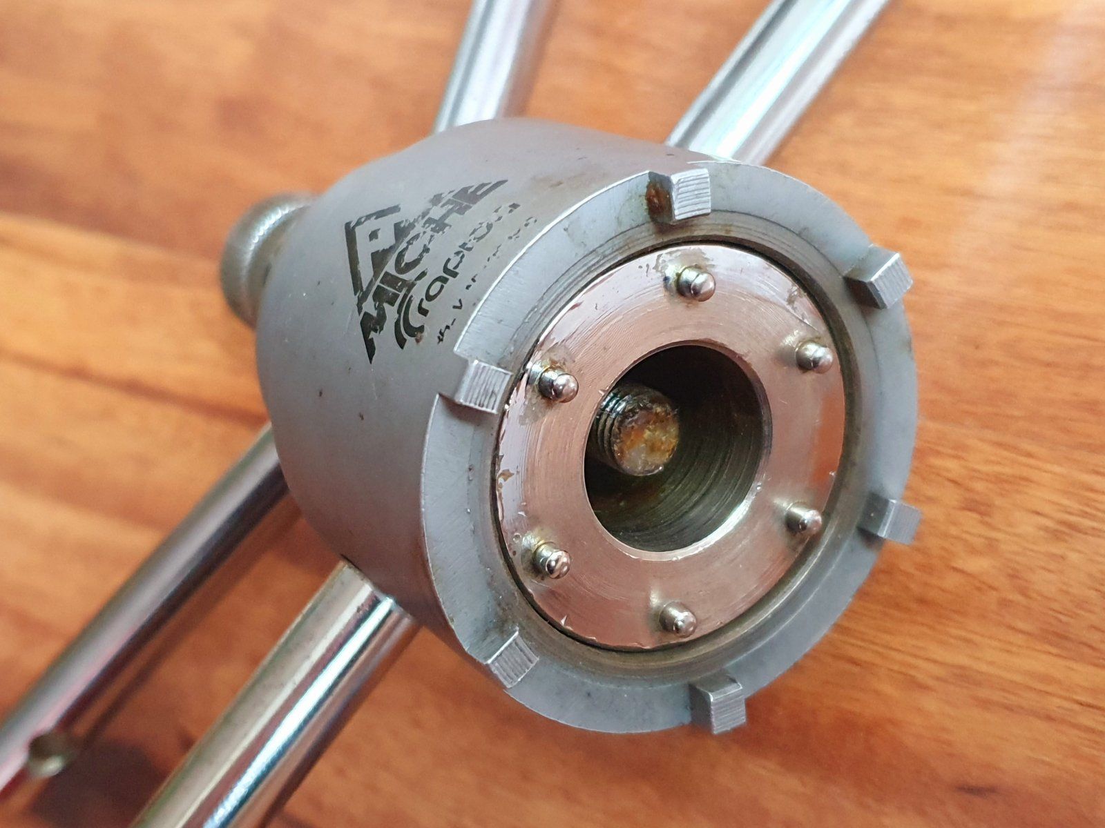 bei meinem werkzeug sind in der ära der stahlrahmen (anfang der 90-er) bei linken verrosteten/festkorrodierten innenlagerschalen die hebel weggebrochen - wurde aber von einem freund gut repariert ... braucht man jetzt in der retro ära wieder deutlich häufiger!Du stellst das Spiel an der Lagerschale einfach mit der inneren Edelstahl-Hülse ein - über die oberen, schräg gestellten Hebelarme. Dann kannst Du einfach mit den längeren Hebelarmen für die äußere, graue Hülse kontern. Über die in der Welle fixierte Rändelschraube sitzt lediglich alles fest, kann nix abrutschen..