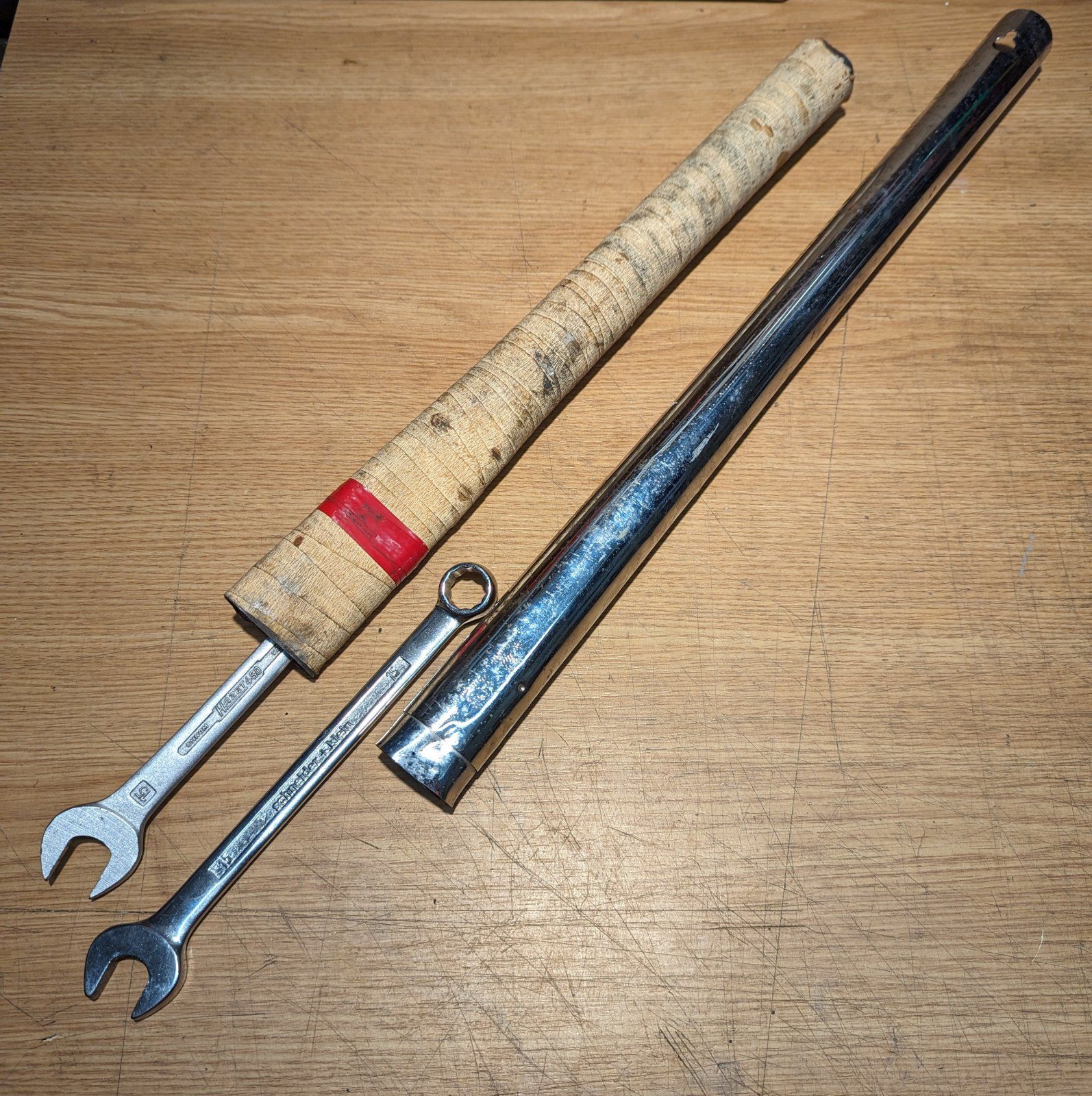 Ich habe mein Verlängerungsrohr für Gabelschlüssel an einem Ende flach geklopft. Dadurch wird es breit genug für große Gabelschlüssel.