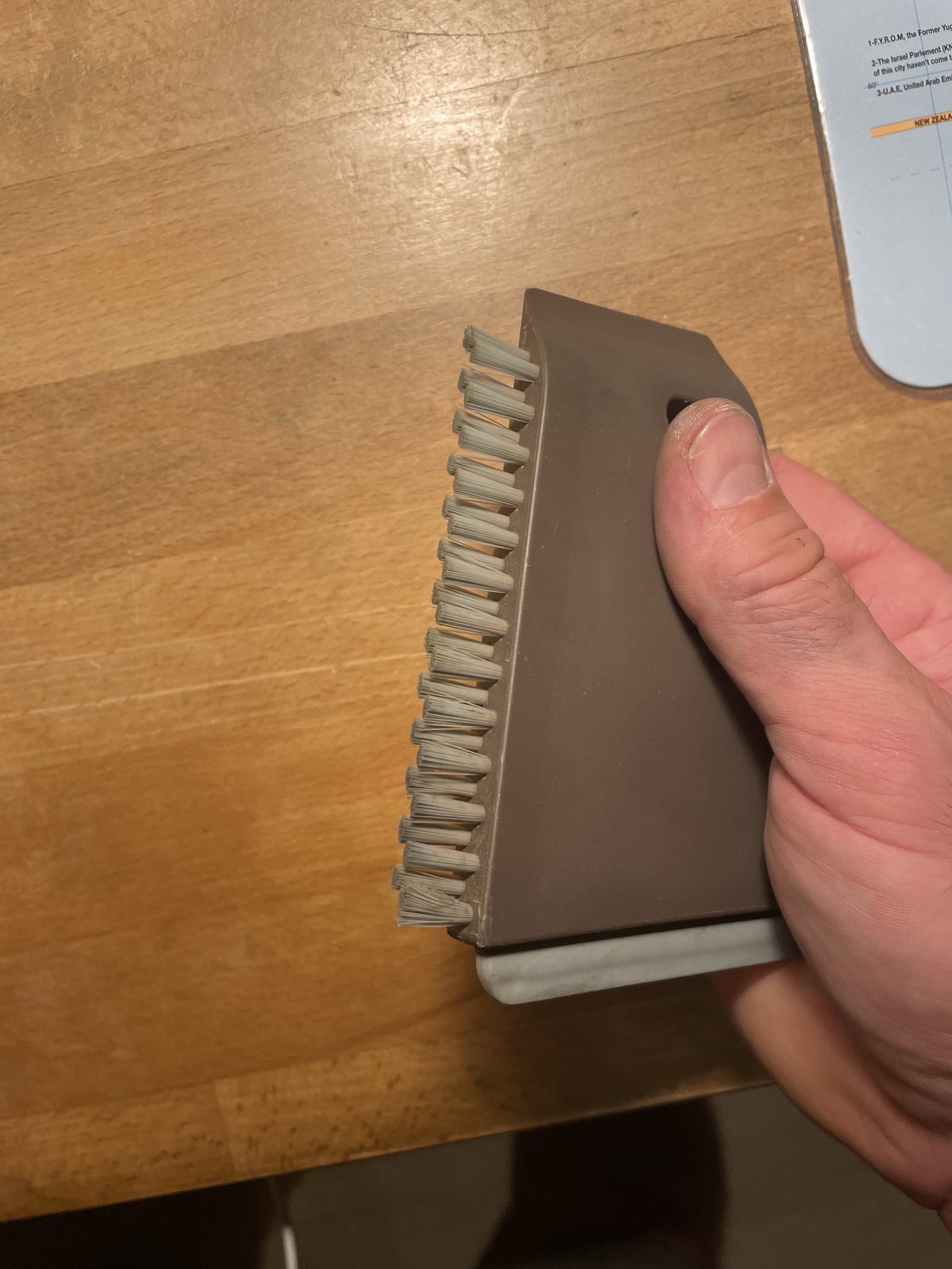 Eine Kante Hartplastik, eine Gummilippe, eine Bürste. Zack.