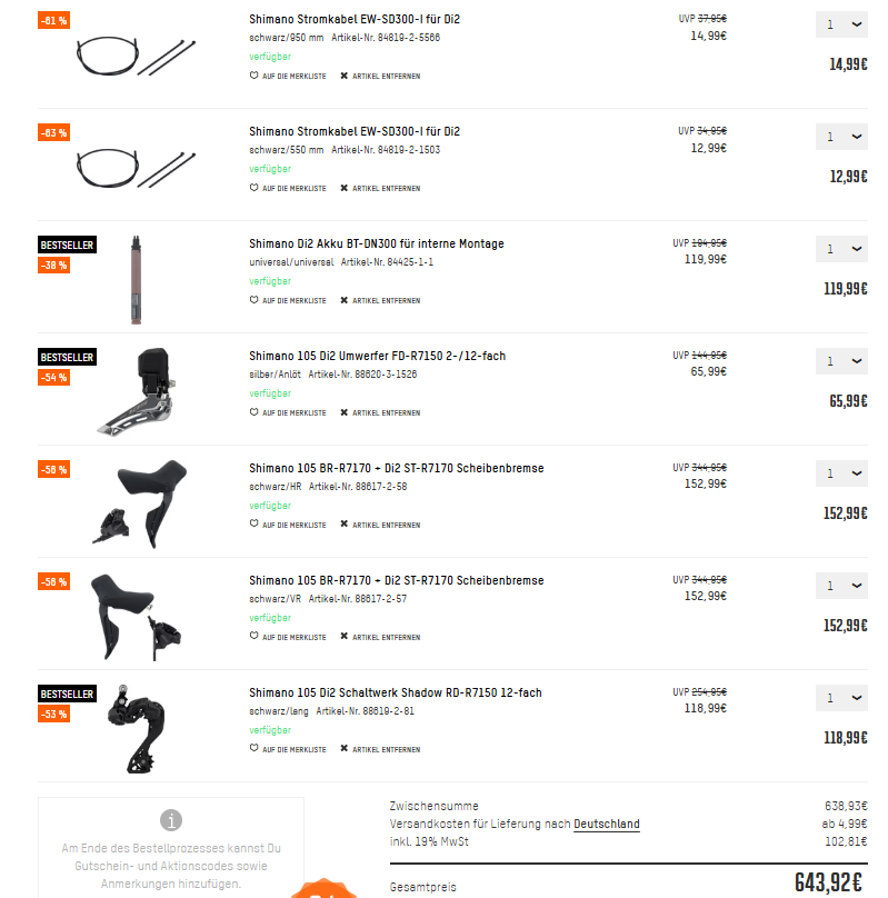 Ladekabel nicht vergessen – falls man noch keins hat. Gibt es auch mit ordentlich Rabatt.Shimano 105 Di2 "Upgrade-Kit" zum zusammenstellen bei bike-components. Newsletteranmeldung übernimmt die Versandkosten.