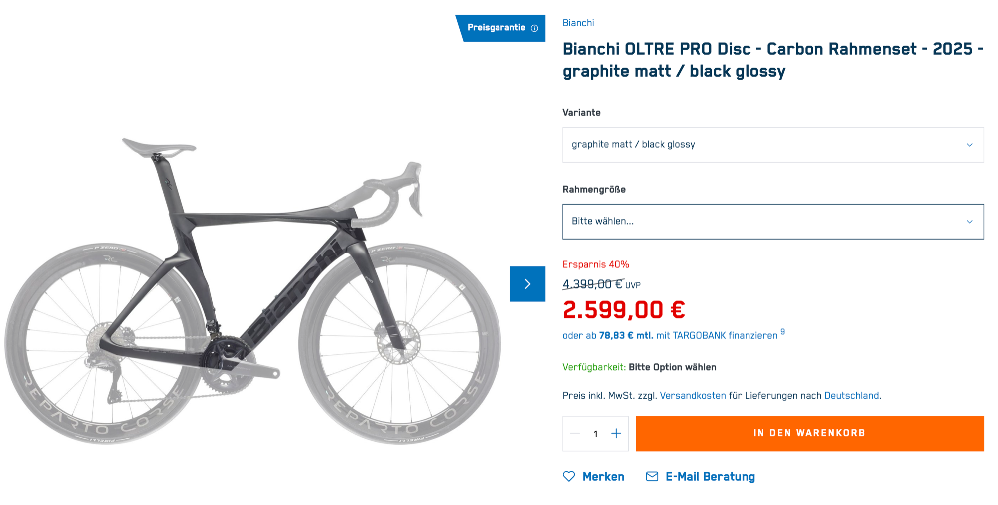 Auf geht‘s, Leute!Rahmenset Bianchi Oltre Pro Disc in 2 Farben. Schwarz alle Größen / Celeste nur 55 für 2.599€