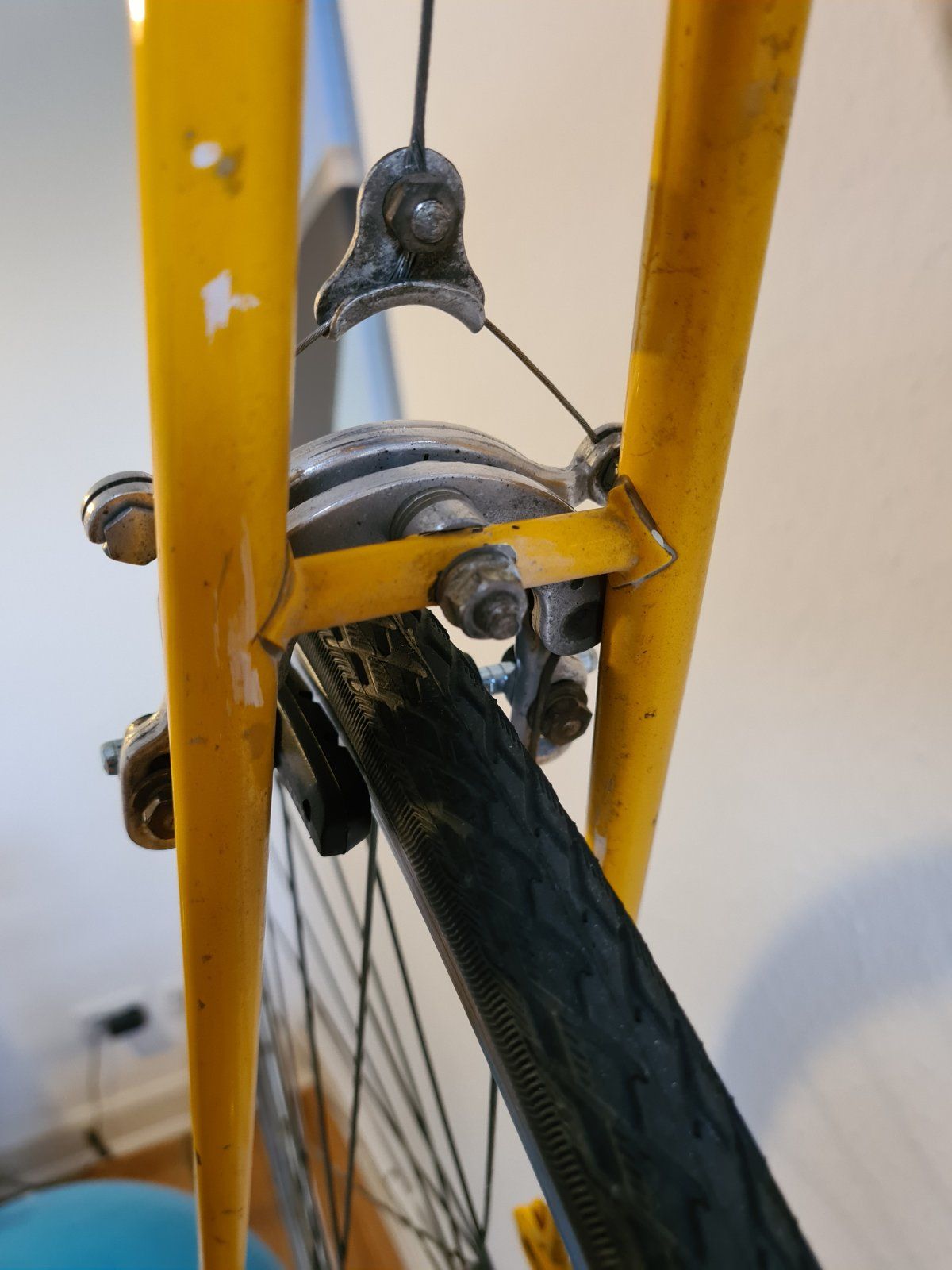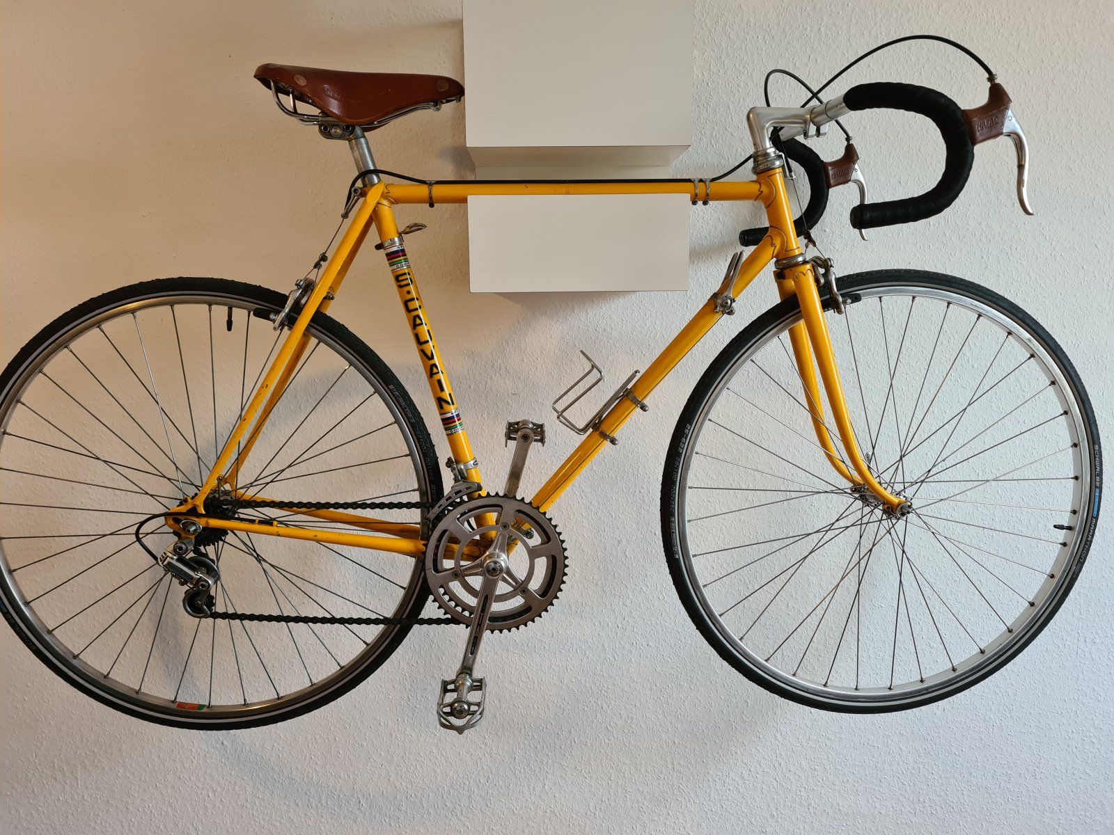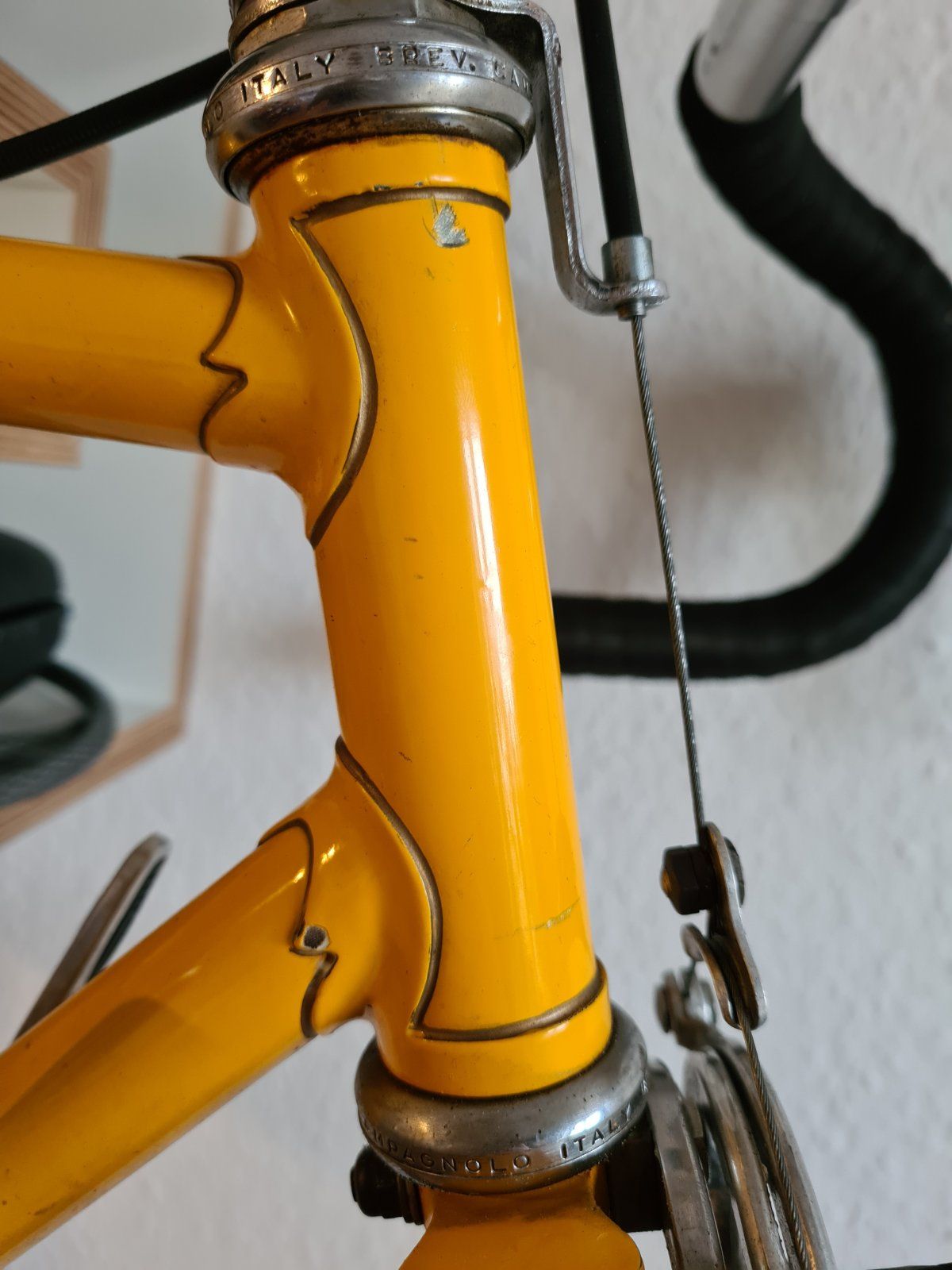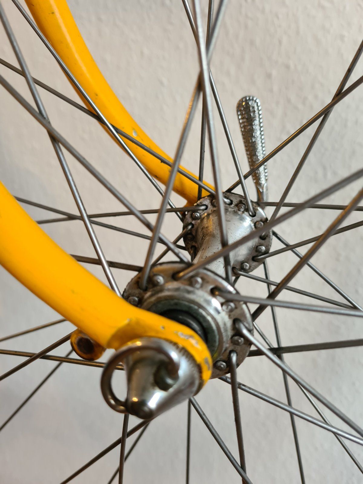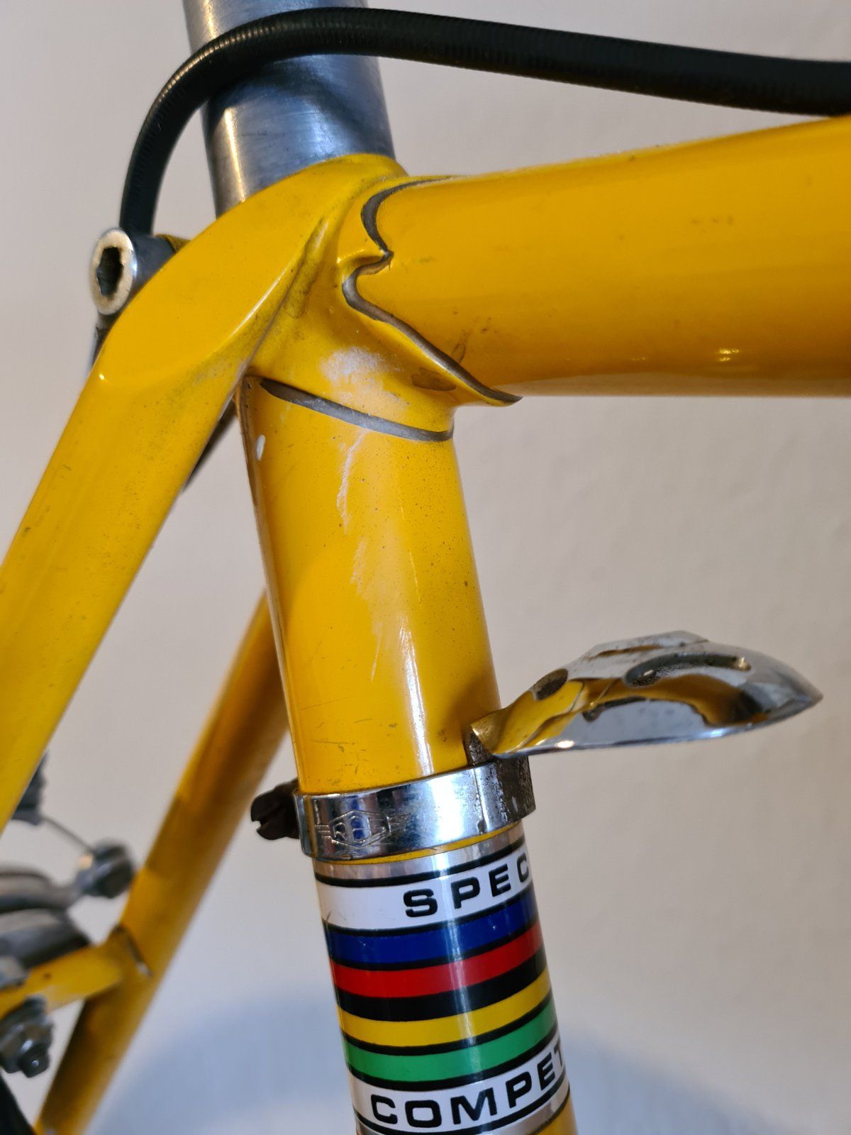 Mein ROCHET. Geschenk eines Freundes, der bei einer Entrümpelung aufgepasst hat. Vemutlich ein 1953 Modell, TdF Replica? Ursprünglich war das Rad rotmetallic mit beigen Muffen. Das beige war nicht auf die Muffen begrenzt, sondern jeweils in die Rahmenrohre übergehend. Soweit das aufgrund der Farbe beim Fund noch nachvollzogen werden konnte. Ursprünglich war (in Erinnerung an mein MOTOBECANE aus der Jugend) Auftrag an den Lacker: ein dunkleres gelbmetallic. Als der Rahmen zurück kam, war das "etwas andere gelb" in der Kiste...