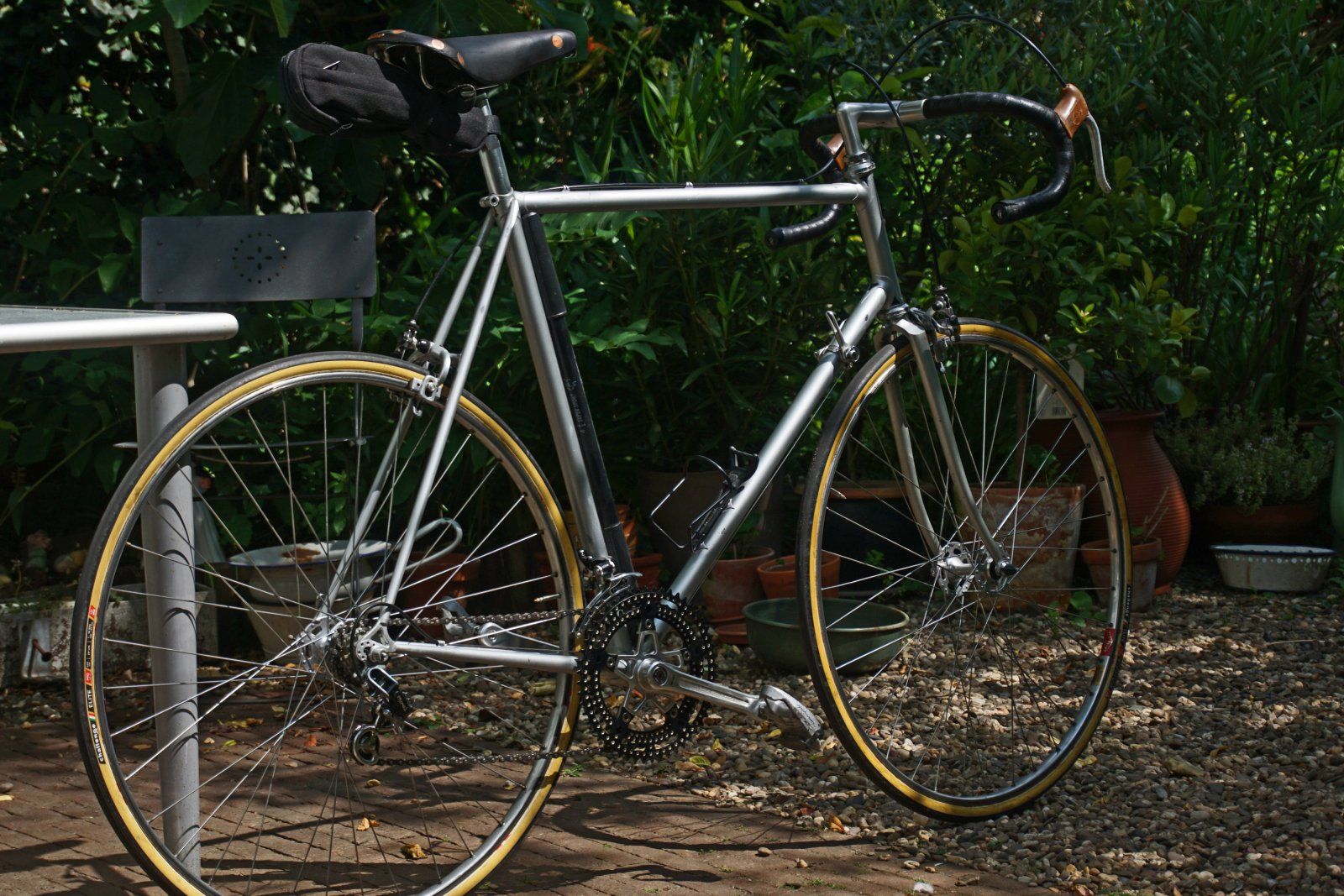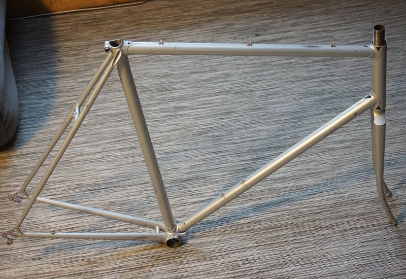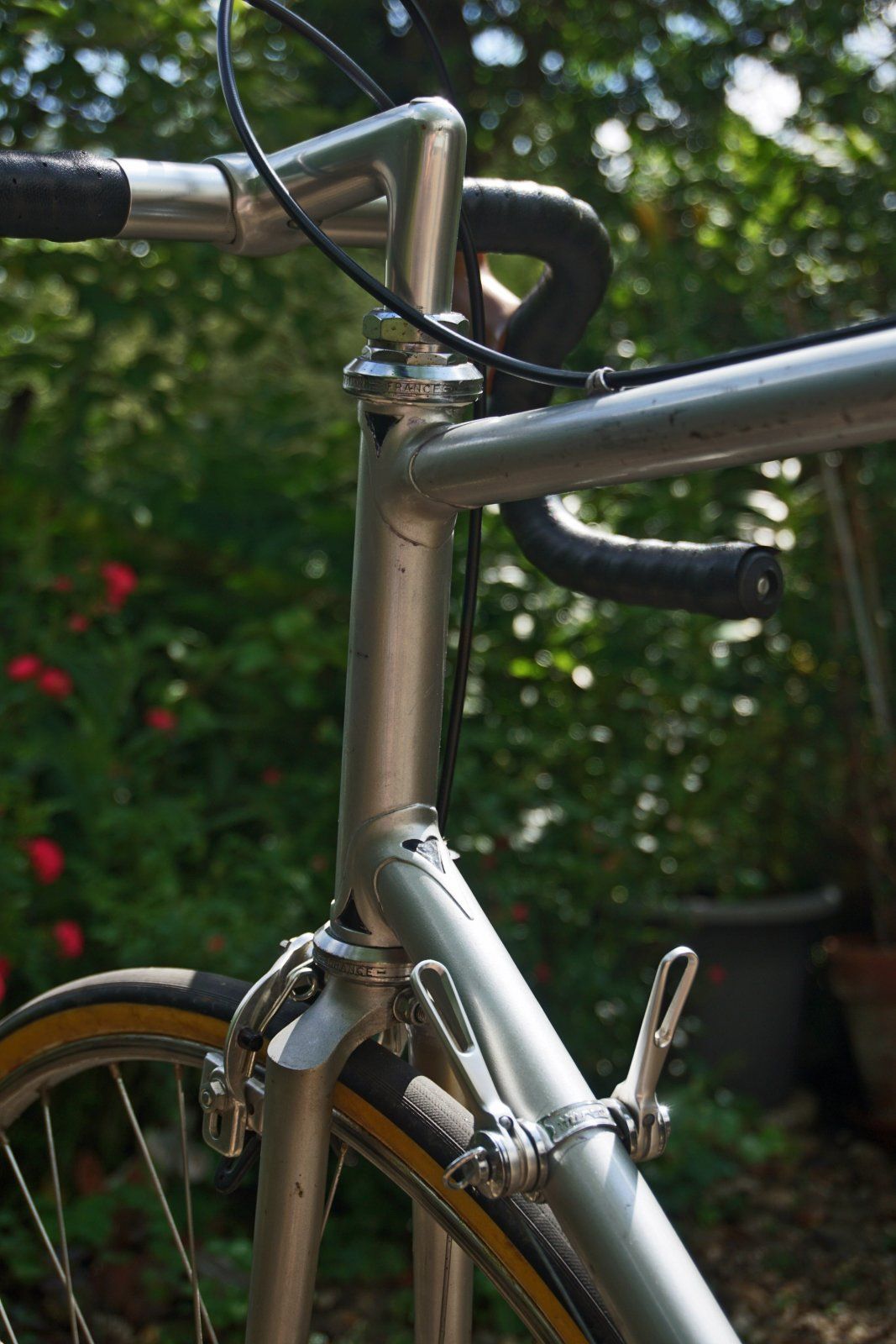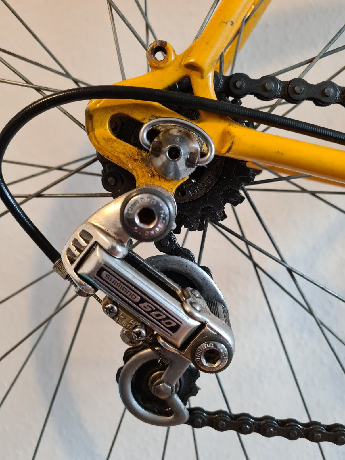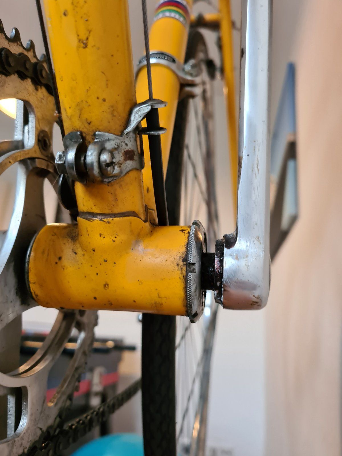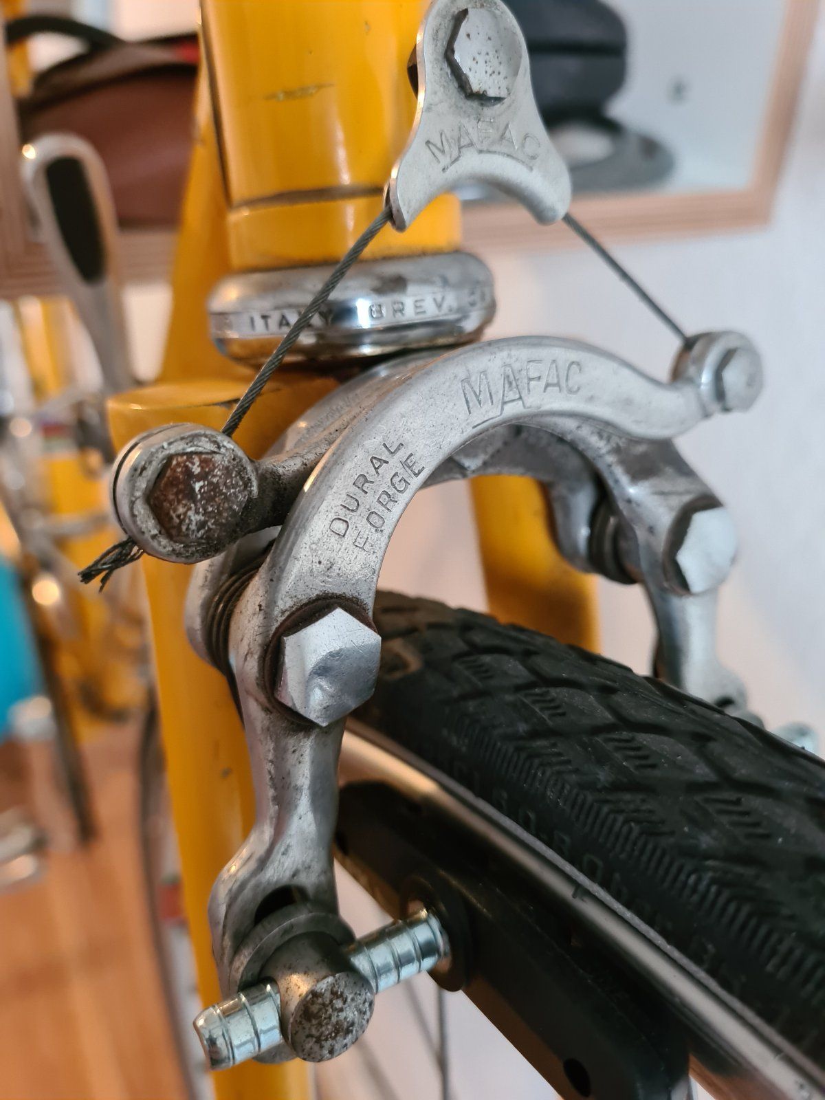 Mein ROCHET. Geschenk eines Freundes, der bei einer Entrümpelung aufgepasst hat. Vemutlich ein 1953 Modell, TdF Replica? Ursprünglich war das Rad rotmetallic mit beigen Muffen. Das beige war nicht auf die Muffen begrenzt, sondern jeweils in die Rahmenrohre übergehend. Soweit das aufgrund der Farbe beim Fund noch nachvollzogen werden konnte. Ursprünglich war (in Erinnerung an mein MOTOBECANE aus der Jugend) Auftrag an den Lacker: ein dunkleres gelbmetallic. Als der Rahmen zurück kam, war das "etwas andere gelb" in der Kiste...