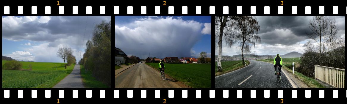 So, heute hat es endlich mal wieder mit dem Radeln geklappt. Es war zwar wieder ein kräftiger, kalter Wind und die Temperaturen spielten auch verrückt (innerhalb von 1,5 Stunden von 6 auf 10 Grad und dann runter auf 4), aber wenigstens habe ich von den Schauern um mich herum nichts abbekommen. Eigentlich wollte ich meine Standardrunde in östliche Richtung fahren. Da war der Himmel aber seehr dunkel und ich habe kurzfristig umdisponiert und erst mal in westliiche Richtung los. Vor mir sah es dann so aus