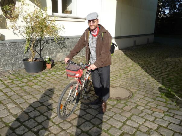 Und da wir schon in klassischen Gefilden schwimmen: hier ein Photo von Bonanzero, ( aus dem Forum, aber noch viel zu jung für hier). Der Kerl ist ein Tausendsassa, wie man sehen kann. Das Bild machte ich am Montag nach Bitterfeld, bei Bo zu Hause im Erzgebirge. Ich hab unglaublich viel von ihm gelernt und sein Radlatelier ist wie bei Ali Baba. Da sieht man Dinge, die gibts gar nicht. Hier kommt er gerade jugendlich-modisch gekleidet von der Arbeit.