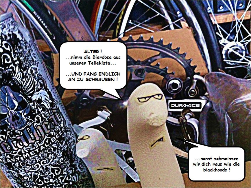 ; zweitens (wichtiger), weil ich sicher sein will, dass sich an den Rändern der Decals keine Lackbruchkanten bilden. Für die Gewichtsfetischisten: der Rahmen wiegt jetzt genau 50g mehr, die Gabel hat 7g mehr auf den Rippen; Gesamtgewicht des Rahmensets also jetzt 2137g + 754g = 2891g (ganz genau genommen noch etwas weniger, weil nach dem Wiegen der Gabelschaft noch gekürzt wurde, den ich aber nicht gewogen habe; ich tippe auf reale 2850g. Gekostet hat der Spass 40€ für die Kaffekasse eines lokalen Lackierbetriebs - die Jungs waren etwas erstaunt, dass jemand das Ding mit allen Macken und alten Aufklebern überlackieren lässt, fanden das Ergebnis aber sehr gut....