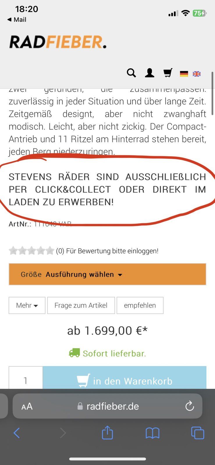 Das Stevens Aspin ist wohl trotzdem nicht möglich. Bei dem Shop, von dem ich eigentlich dachte, er würde es versenden, steht in recht dezenter Schrift „Nur Abholung möglich“. Meine Theorie: die Stevens Versandkartons sind so minderwertig, dass sie den Transport mit der Post nicht überstehen würden oder Stevens verbietet den Online Vertrieb. Ich habe dem Shop aber mal eine Mail geschrieben.