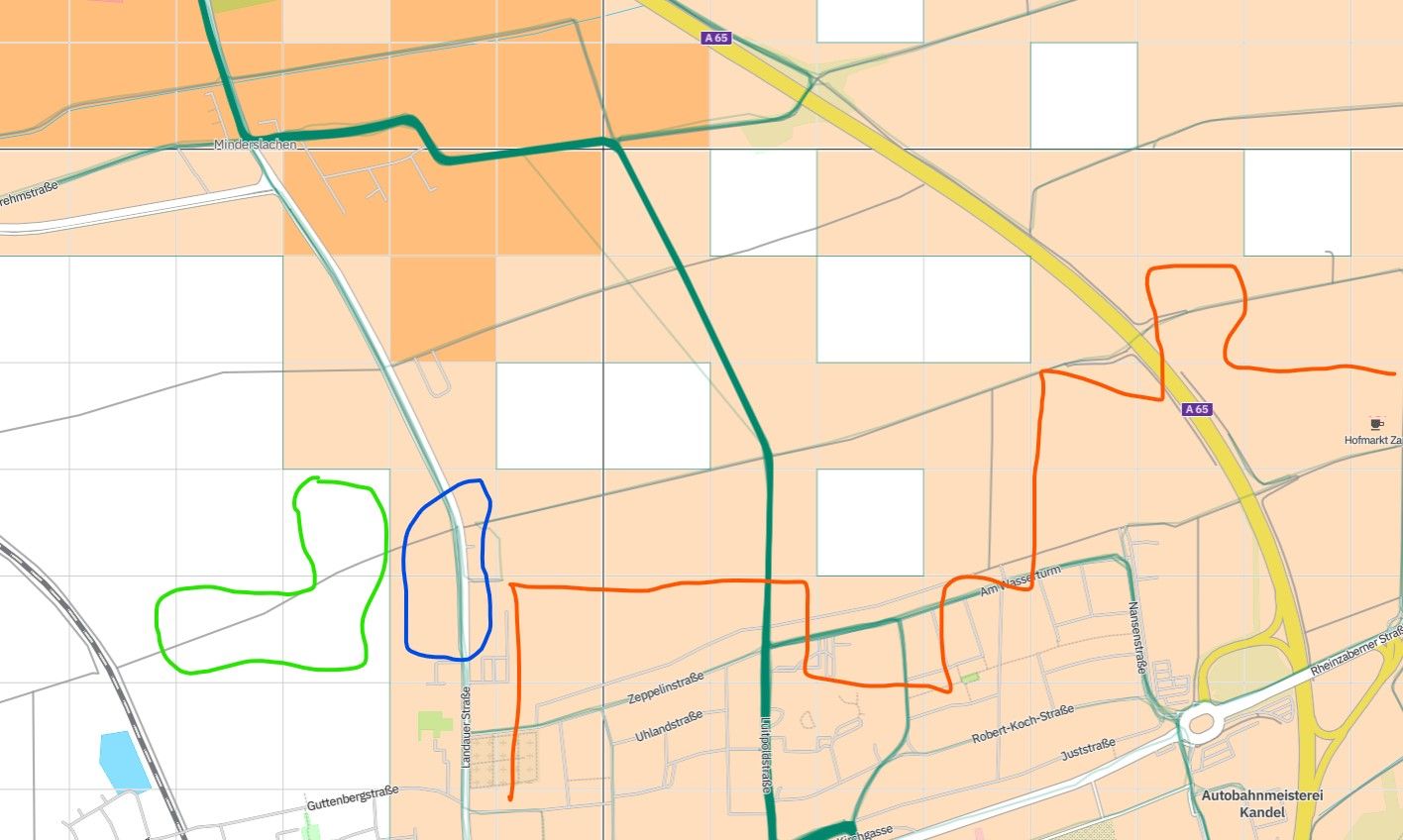 Westlich ist auf vielen Kilometern kein Durchkommen mit drei Squadrationhos (große Äcker, Bachauen, Waldflächen). Östlich sind´s auch fast drei Kilometer. Der kleine Zipfel im freien Quadrat links oben ist leider Privatgelände.