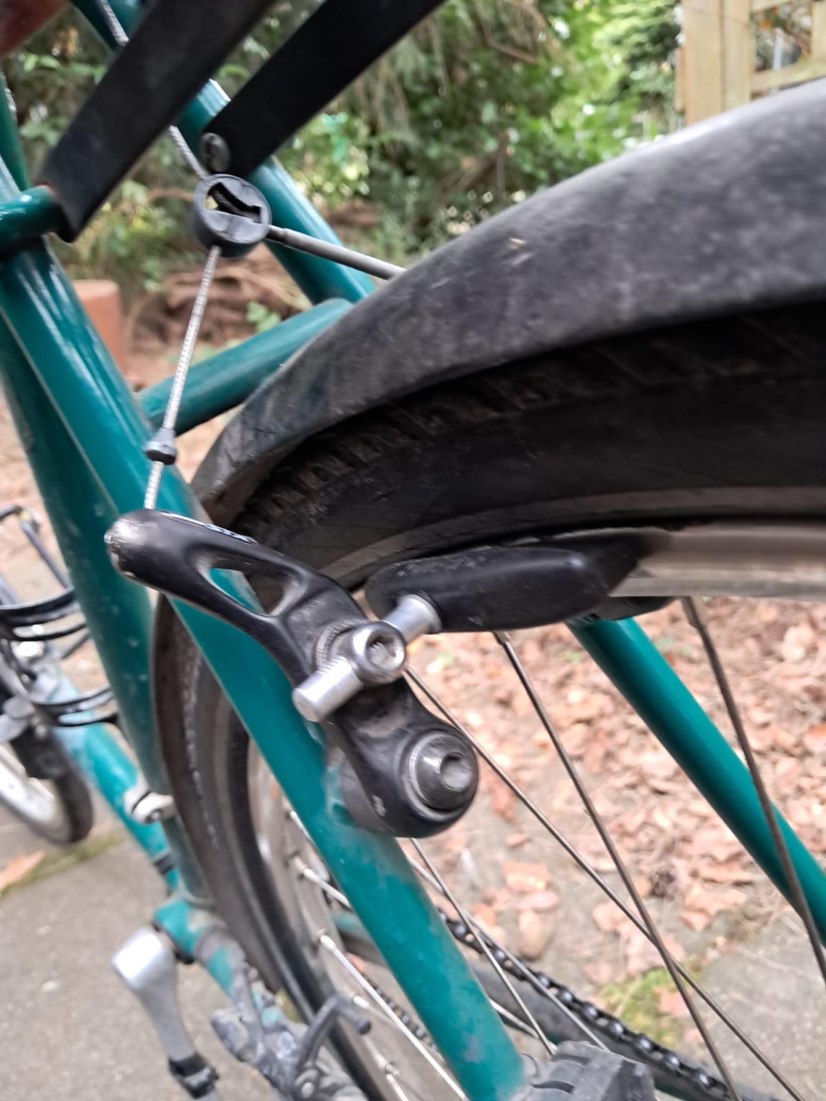 Dein heutiges Bremssetup ist optimalisiert für eine maximale Reifenbreite, nicht für eine maximale Bremsleistung. Du hast sehr viel Platz zwischen Reifen und Schutzblech. Der Winkel des Bremskabels, vor allem hinten, ist sub-optimal. Der Idealwinkel ist 90Grad (Winkel zwischen Bremsarm und Bremskabel), im Moment dass der Bremsklotz an der Felge anliegt. Du hast schon einen grösseren Winkel mit der Bremse in Ausgangsstellung.