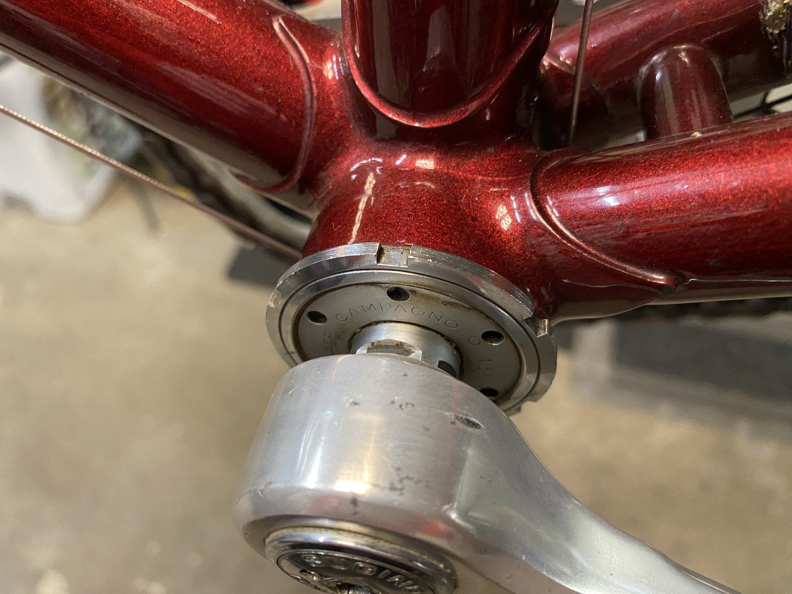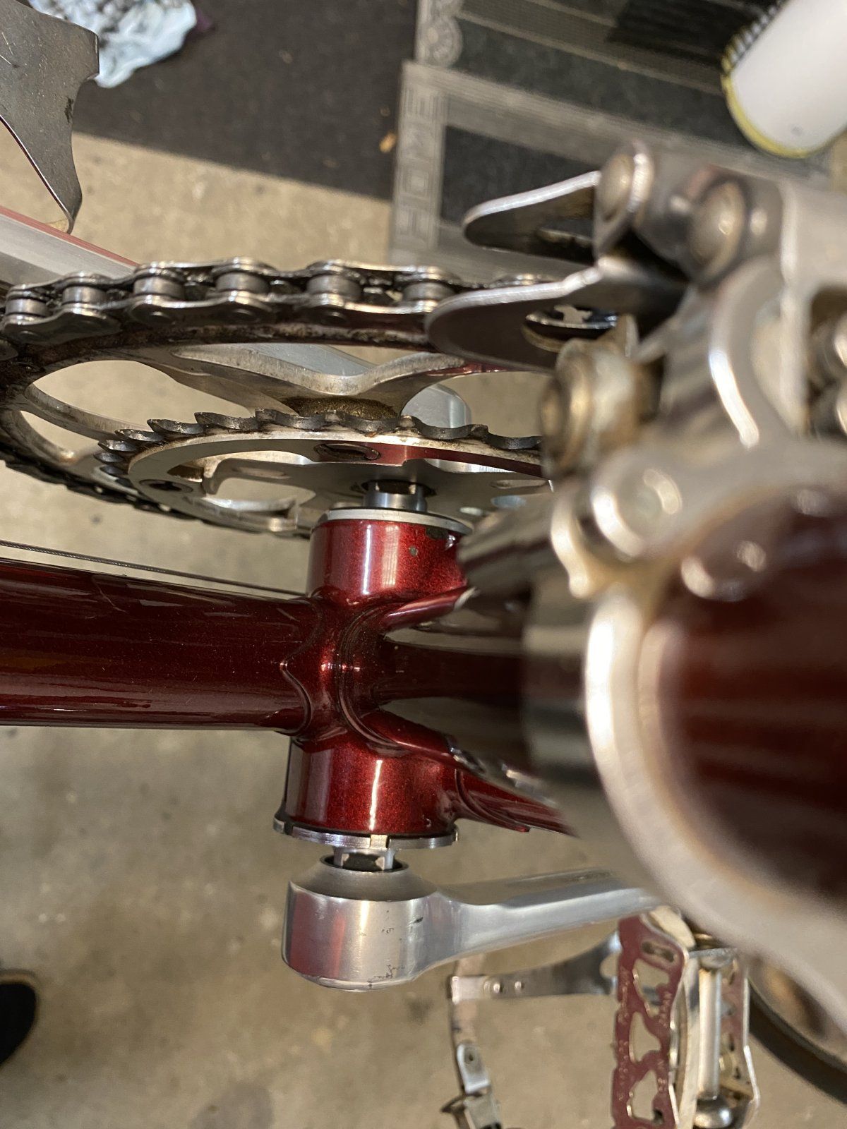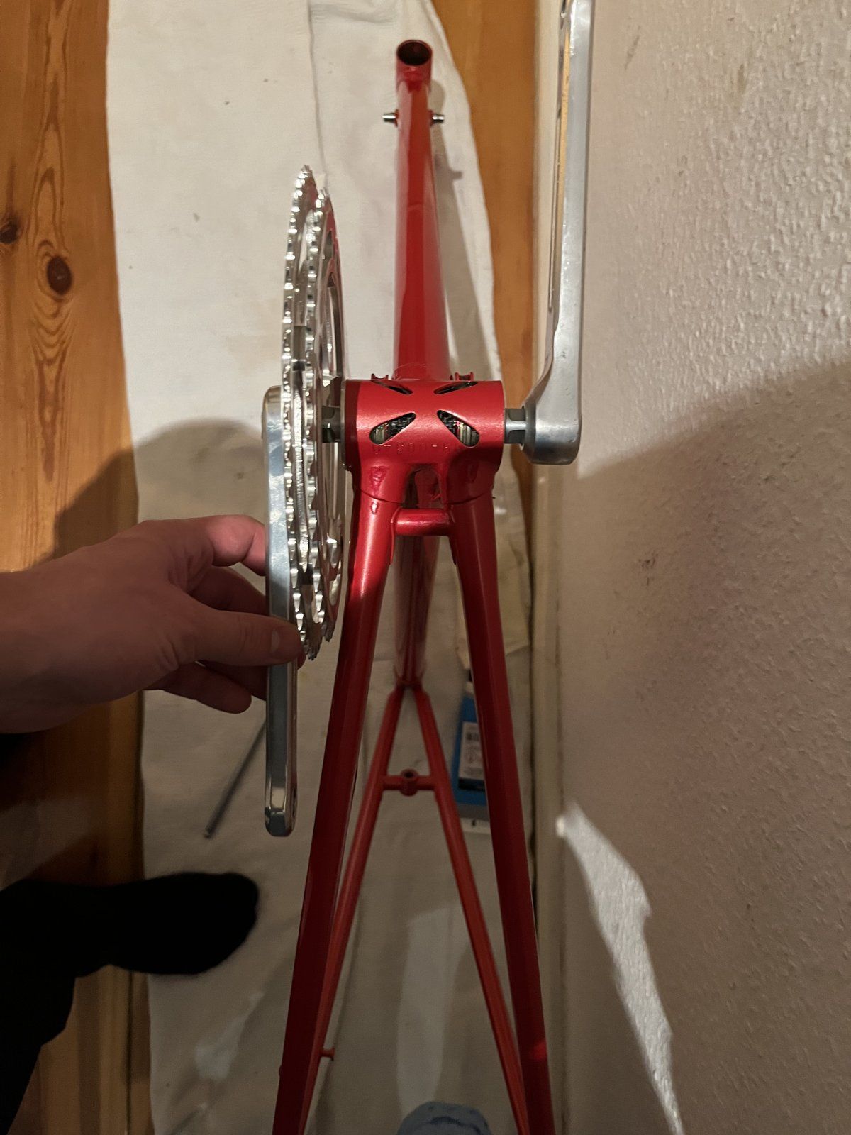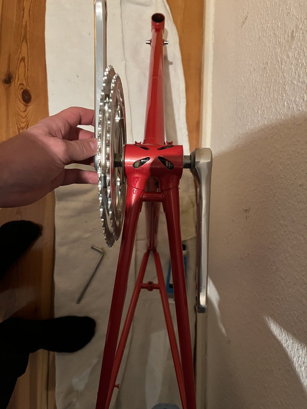 Das kleinere Kettenblatt hat 47 Zähne und bei voll angezogener Kurbelschraube sind noch ca. 3 mm Luft bis zur Kettenstrebe. Das musste ausreichend sein, richtig?