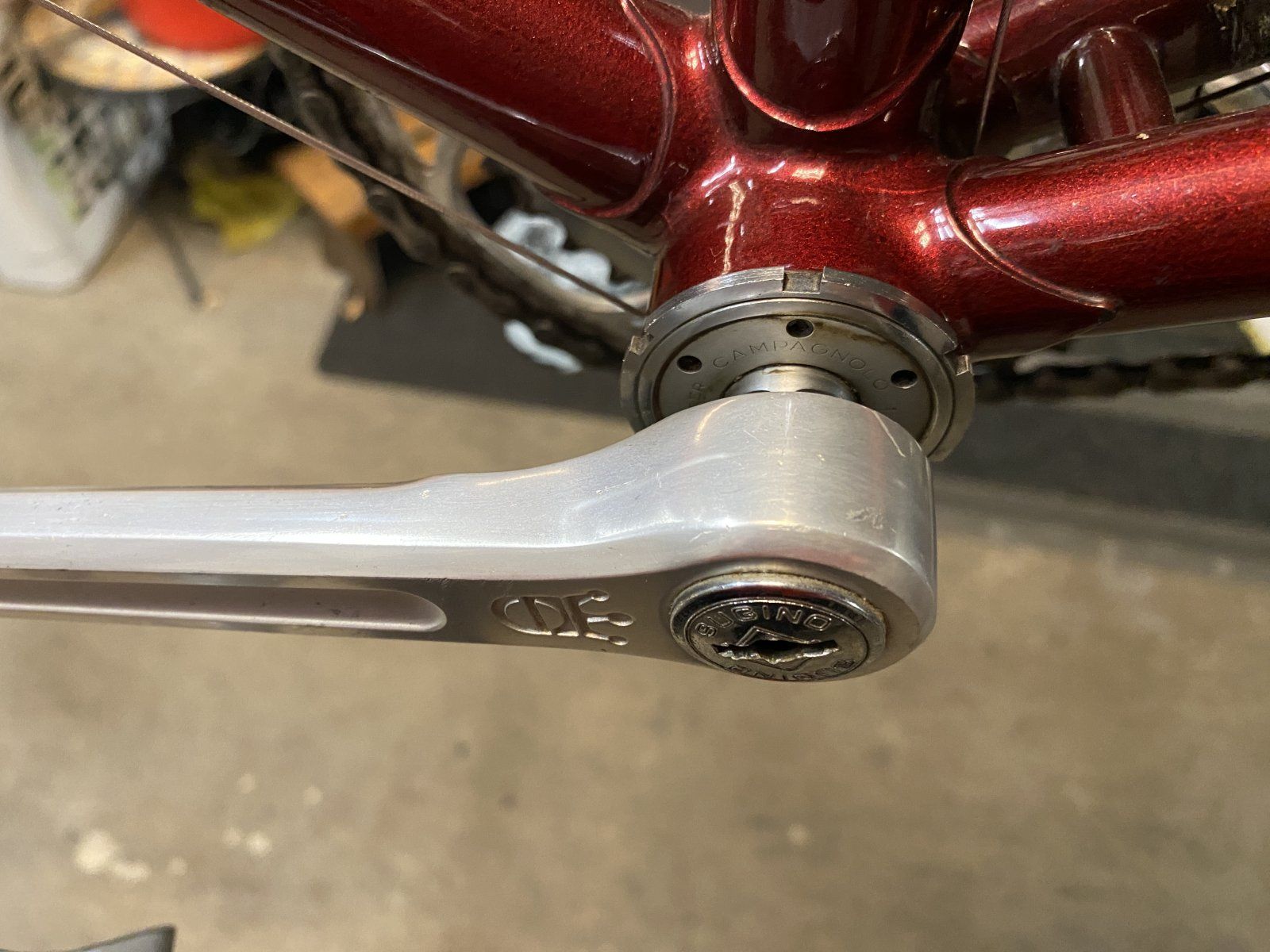 Zeig' Mal den Abstand der Kurbel links rechts zu den Streben. Ich denke, besser geht's mit symetrischer Welle nicht.So ich habe das jetzt mal mit einem Token Innenlager mit 115 mm ISO Welle ausprobiert und es schaut ganz gut aus.