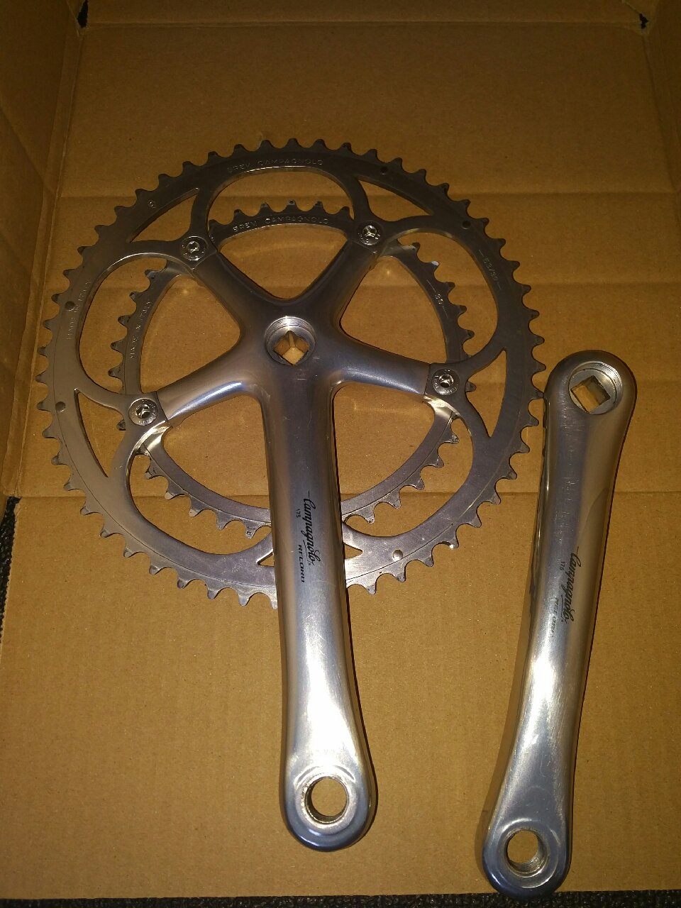 Hier liegen zwei Campagnolo Record-Kurbeln, die ich nicht benötige. Einmal 9f in 175mm: