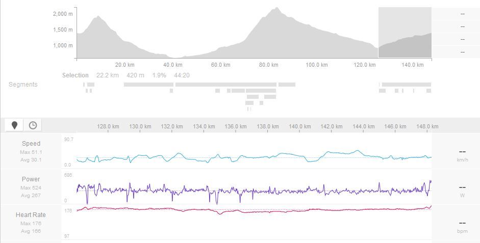 Aber ich bin - nach einem kurzen Antritt in der Steigung vor der Wende - die letzten 20 Kilometer auch vollkommen allein als EZF gefahren. Sah so aus: