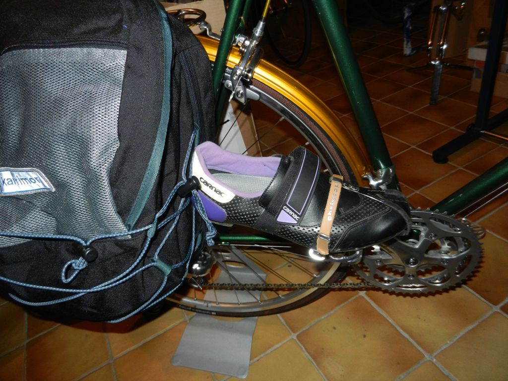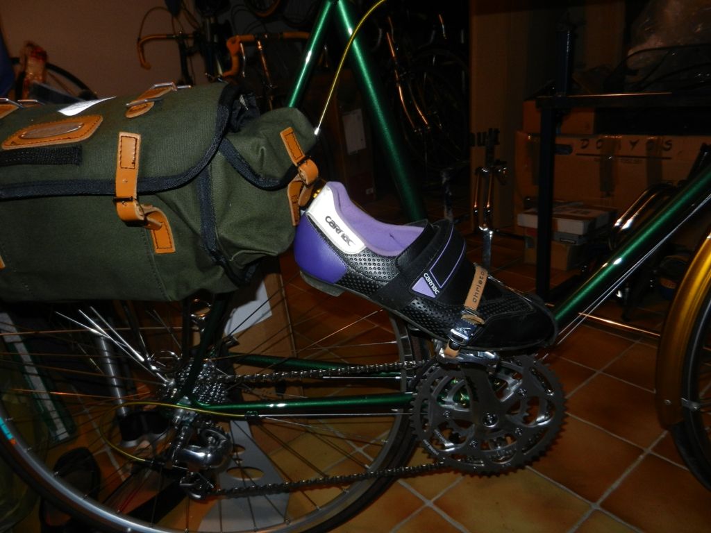 Die Carradice ist wegen der Seitentaschen auch recht lang, interferiert aber weniger mit dem Schuh, das könnte sogar funktionieren.